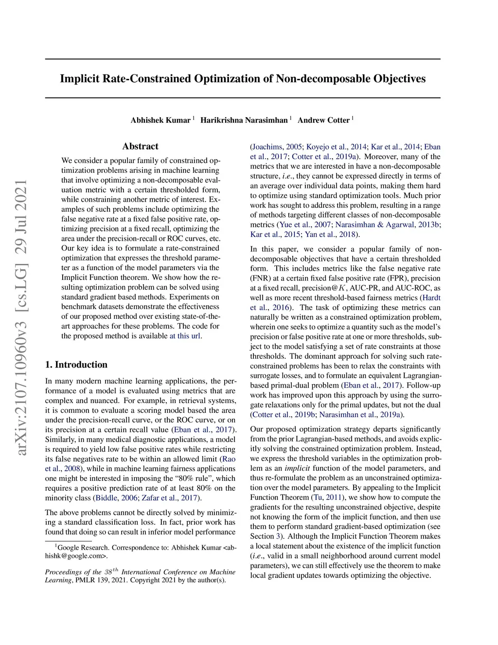 We consider a popular family of constrained optimization problems arising in machine learning that involve optimizing a non-decomposable evaluation metric with a certain thresholded form, while constraining another metric of interest. Examples of such problems include optimizing the false negative rate at a fixed false positive rate, optimizing precision at a fixed recall, optimizing the area under the precision-recall or ROC curves, etc. Our key idea is to formulate a rate-constrained optimization that expresses the threshold parameter as a function of the model parameters via the Implicit Function theorem. We show how the resulting optimization problem can be solved using standard gradient based methods. Experiments on benchmark datasets demonstrate the effectiveness of our proposed method over existing state-of-the art approaches for these problems. The code for the proposed method is available at https://github.com/google-research/google-research/tree/master/implicit_constrained_optimization .