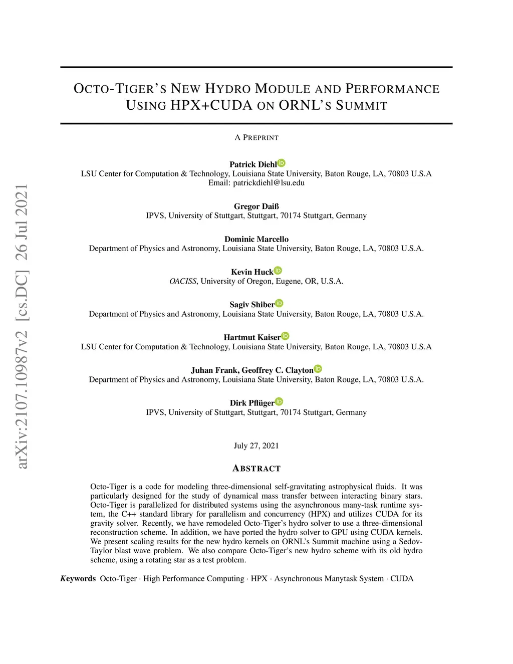 Octo-Tiger's New Hydro Module and Performance Using HPX+CUDA on ORNL's