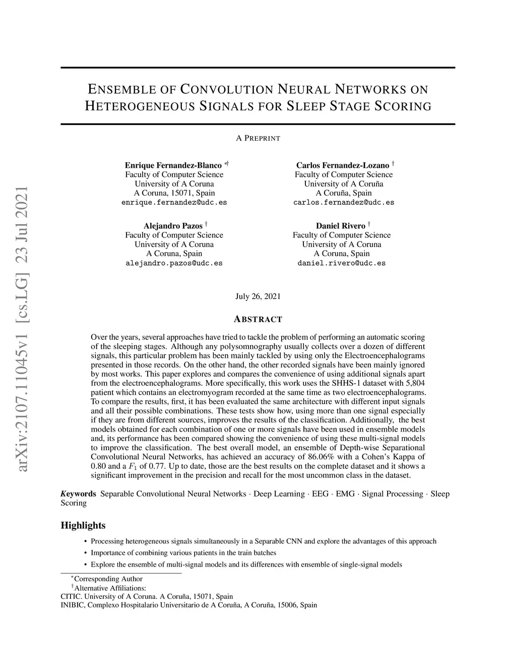 Over the years, several approaches have tried to tackle the problem of performing an automatic scoring of the sleeping stages. Although any polysomnography usually collects over a dozen of different signals, this particular problem has been mainly tackled by using only the Electroencephalograms presented in those records. On the other hand, the other recorded signals have been mainly ignored by most works. This paper explores and compares the convenience of using additional signals apart from electroencephalograms. More specifically, this work uses the SHHS-1 dataset with 5,804 patients containing an electromyogram recorded simultaneously as two electroencephalograms. To compare the results, first, the same architecture has been evaluated with different input signals and all their possible combinations. These tests show how, using more than one signal especially if they are from different sources, improves the results of the classification. Additionally, the best models obtained for each combination of one or more signals have been used in ensemble models and, its performance has been compared showing the convenience of using these multi-signal models to improve the classification. The best overall model, an ensemble of Depth-wise Separational Convolutional Neural Networks, has achieved an accuracy of 86.06\% with a Cohen's Kappa of 0.80 and a of 0.77. Up to date, those are the best results on the complete dataset and it shows a significant improvement in the precision and recall for the most uncommon class in the dataset.
