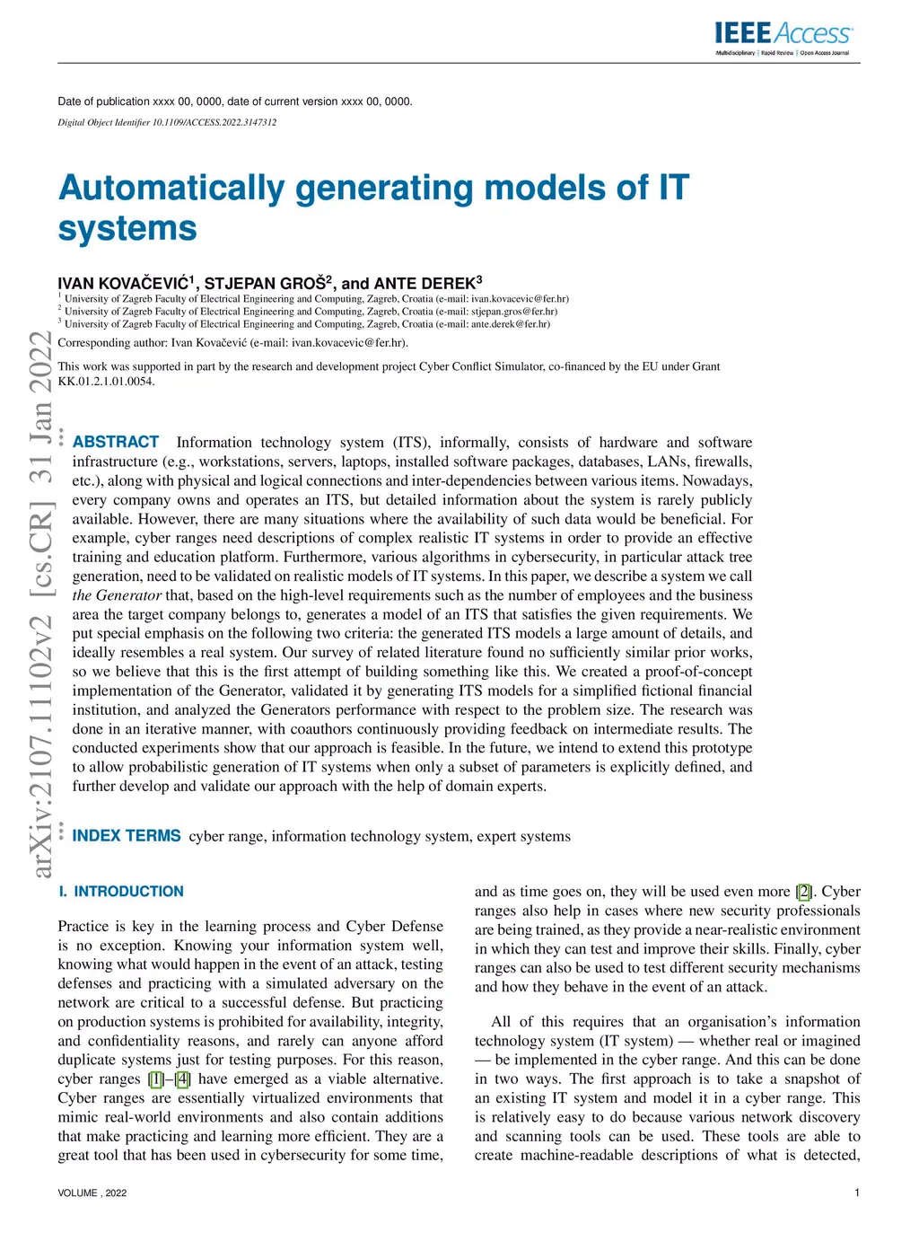 Information technology system (ITS), informally, consists of hardware and software infrastructure (e.g., workstations, servers, laptops, installed software packages, databases, LANs, firewalls, etc.), along with physical and logical connections and inter-dependencies between various items. Nowadays, every company owns and operates an ITS, but detailed information about the system is rarely publicly available. However, there are many situations where the availability of such data would be beneficial. For example, cyber ranges need descriptions of complex realistic IT systems in order to provide an effective training and education platform. Furthermore, various algorithms in cybersecurity, in particular attack tree generation, need to be validated on realistic models of IT systems. In this paper, we describe a system we call the Generator that, based on the high-level requirements such as the number of employees and the business area the target company belongs to, generates a model of an ITS that satisfies the given requirements. We put special emphasis on the following two criteria: the generated ITS models a large amount of details, and ideally resembles a real system. Our survey of related literature found no sufficiently similar prior works, so we believe that this is the first attempt of building something like this. We created a proof-of-concept implementation of the Generator, validated it by generating ITS models for a simplified fictional financial institution, and analyzed the Generators performance with respect to the problem size. The research was done in an iterative manner, with coauthors continuously providing feedback on intermediate results. (...) We intend to extend this prototype to allow probabilistic generation of IT systems when only a subset of parameters is explicitly defined, and further develop and validate our approach with the help of domain experts.