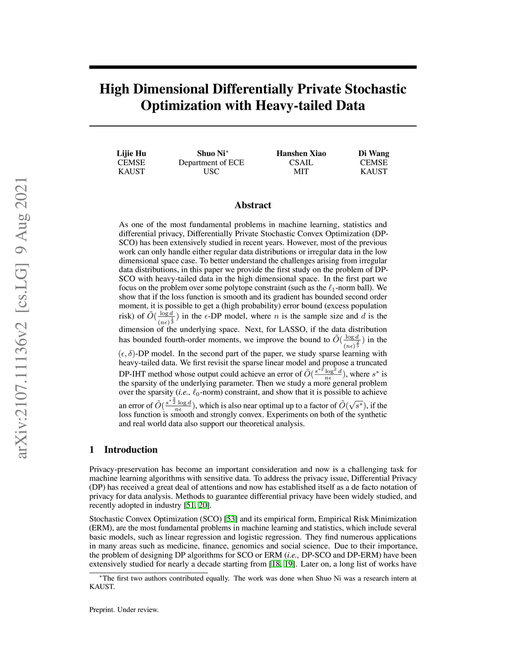 As one of the most fundamental problems in machine learning, statistics and differential privacy, Differentially Private Stochastic Convex Optimization (DP-SCO) has been extensively studied in recent years. However, most of the previous work can only handle either regular data distribution or irregular data in the low dimensional space case. To better understand the challenges arising from irregular data distribution, in this paper we provide the first study on the problem of DP-SCO with heavy-tailed data in the high dimensional space. In the first part we focus on the problem over some polytope constraint (such as the -norm ball). We show that if the loss function is smooth and its gradient has bounded second order moment, it is possible to get a (high probability) error bound (excess population risk) of in the -DP model, where is the sample size and is the dimensionality of the underlying space. Next, for LASSO, if the data distribution that has bounded fourth-order moments, we improve the bound to in the -DP model. In the second part of the paper, we study sparse learning with heavy-tailed data. We first revisit the sparse linear model and propose a truncated DP-IHT method whose output could achieve an error of , where is the sparsity of the underlying parameter. Then we study a more general problem over the sparsity ({\em i.e.,} -norm) constraint, and show that it is possible to achieve an error of , which is also near optimal up to a factor of , if the loss function is smooth and strongly convex.