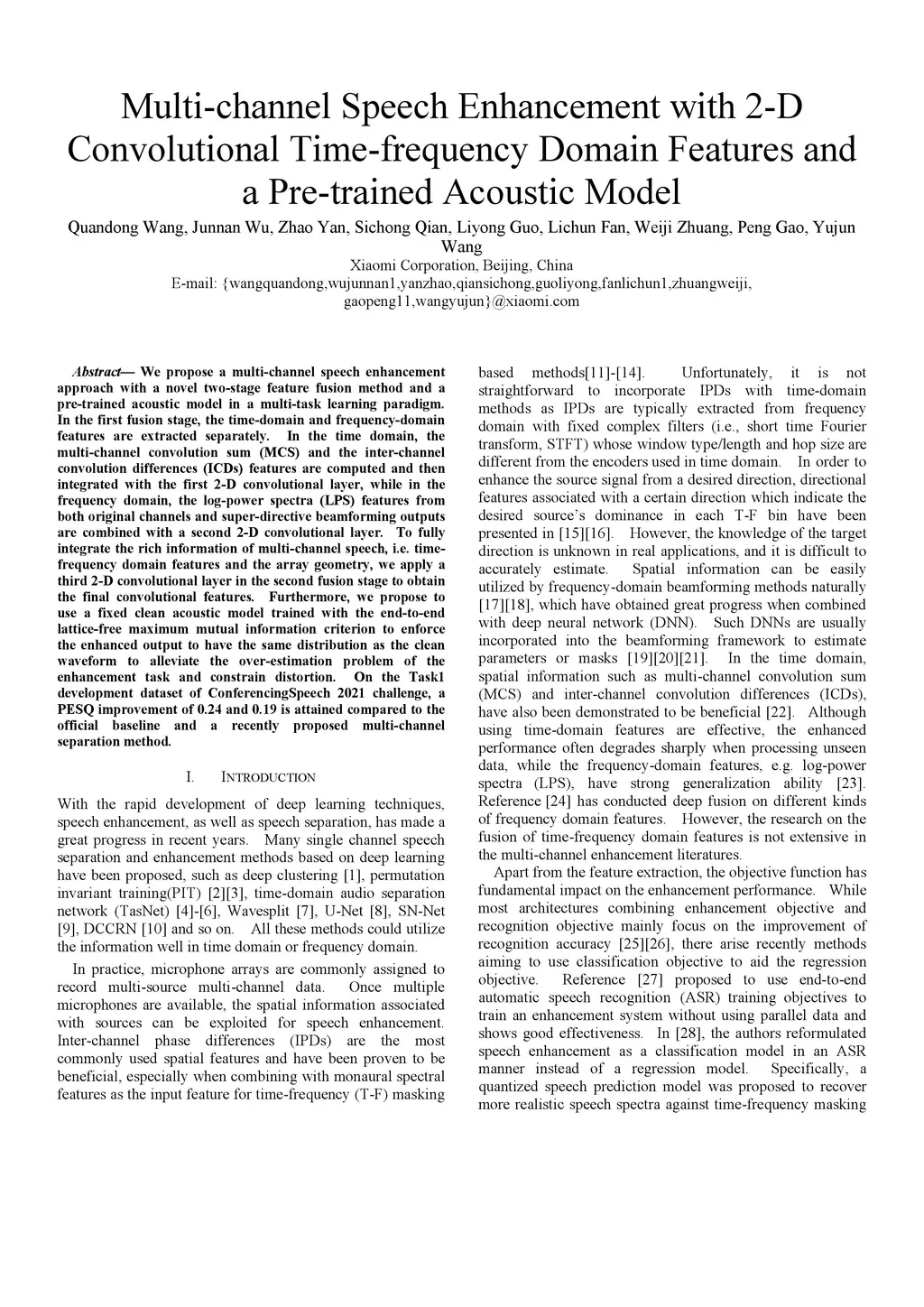 We propose a multi-channel speech enhancement approach with a novel two-stage feature fusion method and a pre-trained acoustic model in a multi-task learning paradigm. In the first fusion stage, the time-domain and frequency-domain features are extracted separately. In the time domain, the multi-channel convolution sum (MCS) and the inter-channel convolution differences (ICDs) features are computed and then integrated with the first 2-D convolutional layer, while in the frequency domain, the log-power spectra (LPS) features from both original channels and super-directive beamforming outputs are combined with a second 2-D convolutional layer. To fully integrate the rich information of multi-channel speech, i.e. time-frequency domain features and the array geometry, we apply a third 2-D convolutional layer in the second fusion stage to obtain the final convolutional features. Furthermore, we propose to use a fixed clean acoustic model trained with the end-to-end lattice-free maximum mutual information criterion to enforce the enhanced output to have the same distribution as the clean waveform to alleviate the over-estimation problem of the enhancement task and constrain distortion. On the Task1 development dataset of ConferencingSpeech 2021 challenge, a PESQ improvement of 0.24 and 0.19 is attained compared to the official baseline and a recently proposed multi-channel separation method.