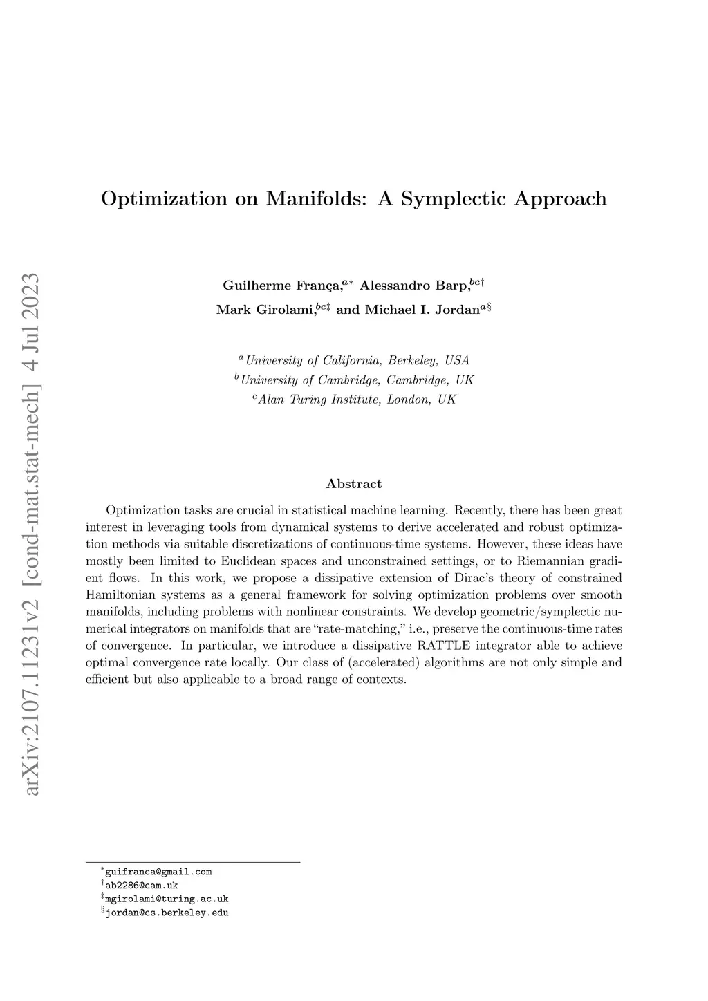 Optimization tasks are crucial in statistical machine learning. Recently, there has been great interest in leveraging tools from dynamical systems to derive accelerated and robust optimization methods via suitable discretizations of continuous-time systems. However, these ideas have mostly been limited to Euclidean spaces and unconstrained settings, or to Riemannian gradient flows. In this work, we propose a dissipative extension of Dirac's theory of constrained Hamiltonian systems as a general framework for solving optimization problems over smooth manifolds, including problems with nonlinear constraints. We develop geometric/symplectic numerical integrators on manifolds that are "rate-matching," i.e., preserve the continuous-time rates of convergence. In particular, we introduce a dissipative RATTLE integrator able to achieve optimal convergence rate locally. Our class of (accelerated) algorithms are not only simple and efficient but also applicable to a broad range of contexts.