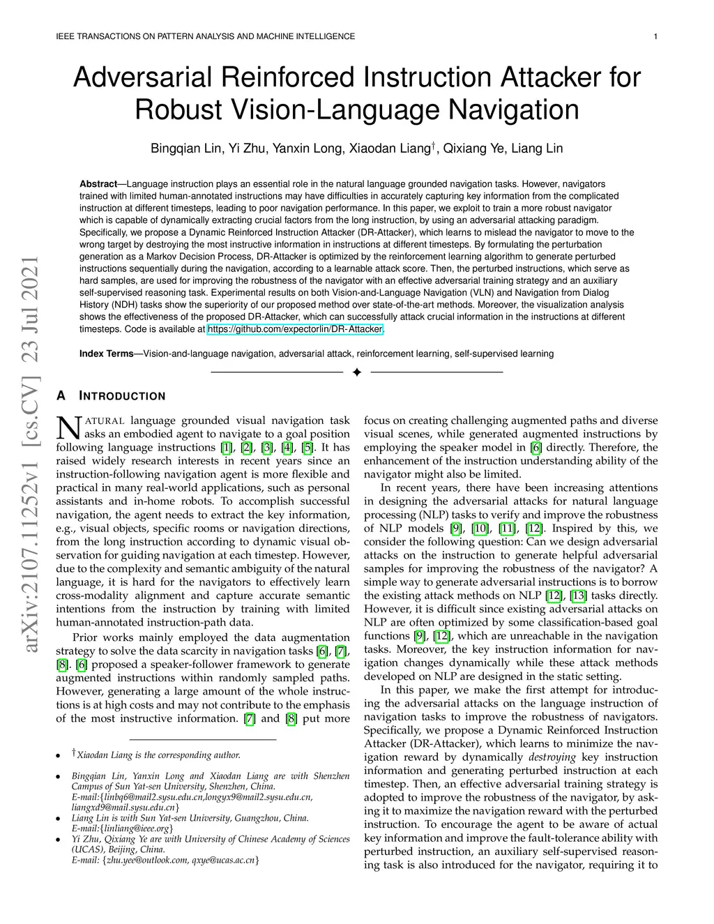 Language instruction plays an essential role in the natural language grounded navigation tasks. However, navigators trained with limited human-annotated instructions may have difficulties in accurately capturing key information from the complicated instruction at different timesteps, leading to poor navigation performance. In this paper, we exploit to train a more robust navigator which is capable of dynamically extracting crucial factors from the long instruction, by using an adversarial attacking paradigm. Specifically, we propose a Dynamic Reinforced Instruction Attacker (DR-Attacker), which learns to mislead the navigator to move to the wrong target by destroying the most instructive information in instructions at different timesteps. By formulating the perturbation generation as a Markov Decision Process, DR-Attacker is optimized by the reinforcement learning algorithm to generate perturbed instructions sequentially during the navigation, according to a learnable attack score. Then, the perturbed instructions, which serve as hard samples, are used for improving the robustness of the navigator with an effective adversarial training strategy and an auxiliary self-supervised reasoning task. Experimental results on both Vision-and-Language Navigation (VLN) and Navigation from Dialog History (NDH) tasks show the superiority of our proposed method over state-of-the-art methods. Moreover, the visualization analysis shows the effectiveness of the proposed DR-Attacker, which can successfully attack crucial information in the instructions at different timesteps. Code is available at https://github.com/expectorlin/DR-Attacker.