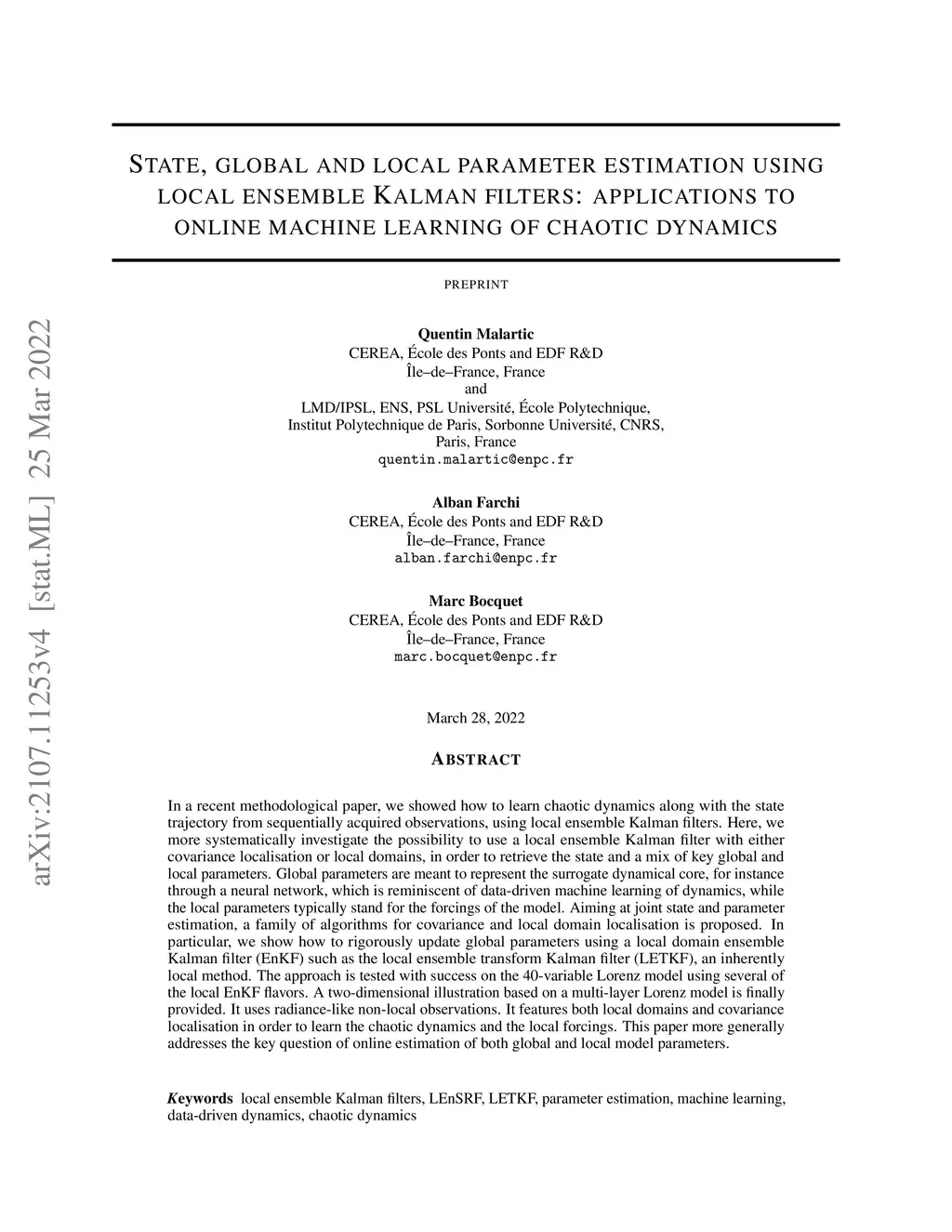 In a recent methodological paper, we showed how to learn chaotic dynamics along with the state trajectory from sequentially acquired observations, using local ensemble Kalman filters. Here, we more systematically investigate the possibility to use a local ensemble Kalman filter with either covariance localisation or local domains, in order to retrieve the state and a mix of key global and local parameters. Global parameters are meant to represent the surrogate dynamical core, for instance through a neural network, which is reminiscent of data-driven machine learning of dynamics, while the local parameters typically stand for the forcings of the model. Aiming at joint state and parameter estimation, a family of algorithms for covariance and local domain localisation is proposed. In particular, we show how to rigorously update global parameters using a local domain ensemble Kalman filter (EnKF) such as the local ensemble transform Kalman filter (LETKF), an inherently local method. The approach is tested with success on the 40-variable Lorenz model using several of the local EnKF flavors. A two-dimensional illustration based on a multi-layer Lorenz model is finally provided. It uses radiance-like non-local observations. It features both local domains and covariance localisation in order to learn the chaotic dynamics and the local forcings. This paper more generally addresses the key question of online estimation of both global and local model parameters.