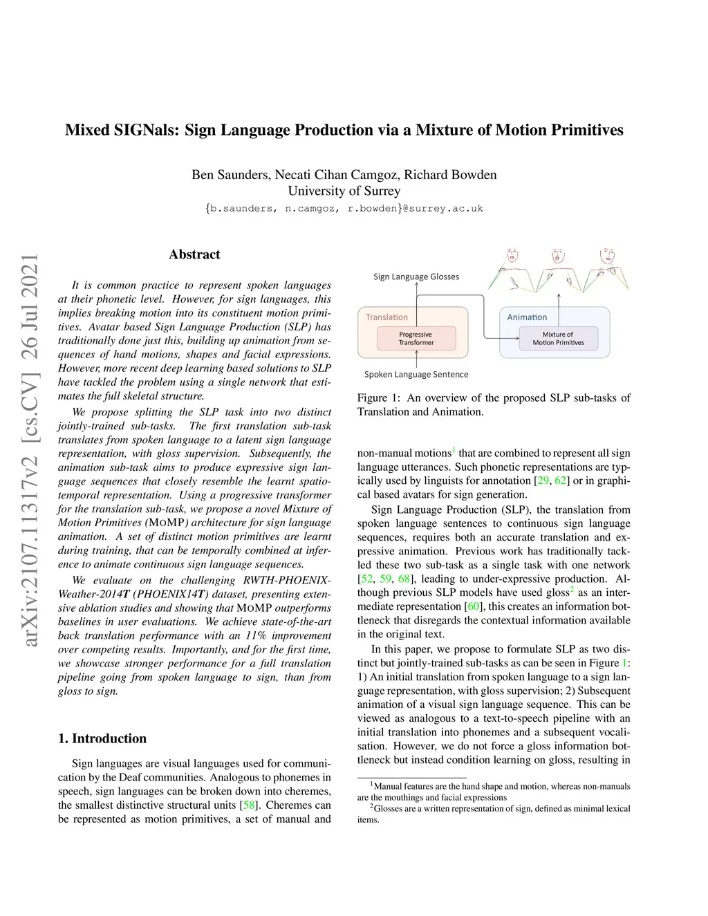 It is common practice to represent spoken languages at their phonetic level. However, for sign languages, this implies breaking motion into its constituent motion primitives. Avatar based Sign Language Production (SLP) has traditionally done just this, building up animation from sequences of hand motions, shapes and facial expressions. However, more recent deep learning based solutions to SLP have tackled the problem using a single network that estimates the full skeletal structure. We propose splitting the SLP task into two distinct jointly-trained sub-tasks. The first translation sub-task translates from spoken language to a latent sign language representation, with gloss supervision. Subsequently, the animation sub-task aims to produce expressive sign language sequences that closely resemble the learnt spatio-temporal representation. Using a progressive transformer for the translation sub-task, we propose a novel Mixture of Motion Primitives (MoMP) architecture for sign language animation. A set of distinct motion primitives are learnt during training, that can be temporally combined at inference to animate continuous sign language sequences. We evaluate on the challenging RWTH-PHOENIX-Weather-2014T(PHOENIX14T) dataset, presenting extensive ablation studies and showing that MoMP outperforms baselines in user evaluations. We achieve state-of-the-art back translation performance with an 11% improvement over competing results. Importantly, and for the first time, we showcase stronger performance for a full translation pipeline going from spoken language to sign, than from gloss to sign.