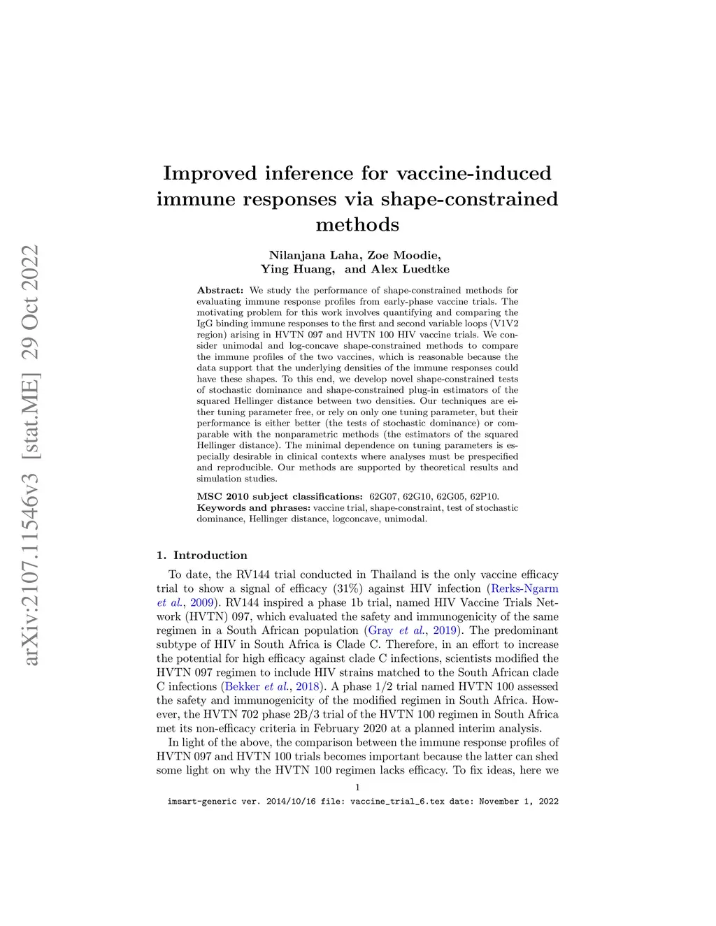 We study the performance of shape-constrained methods for evaluating immune response profiles from early-phase vaccine trials. The motivating problem for this work involves quantifying and comparing the IgG binding immune responses to the first and second variable loops (V1V2 region) arising in HVTN 097 and HVTN 100 HIV vaccine trials. We consider unimodal and log-concave shape-constrained methods to compare the immune profiles of the two vaccines, which is reasonable because the data support that the underlying densities of the immune responses could have these shapes. To this end, we develop novel shape-constrained tests of stochastic dominance and shape-constrained plug-in estimators of the Hellinger distance between two densities. Our techniques are either tuning parameter free, or rely on only one tuning parameter, but their performance is either better (the tests of stochastic dominance) or comparable with the nonparametric methods (the estimators of Hellinger distance). The minimal dependence on tuning parameters is especially desirable in clinical contexts where analyses must be prespecified and reproducible. Our methods are supported by theoretical results and simulation studies.