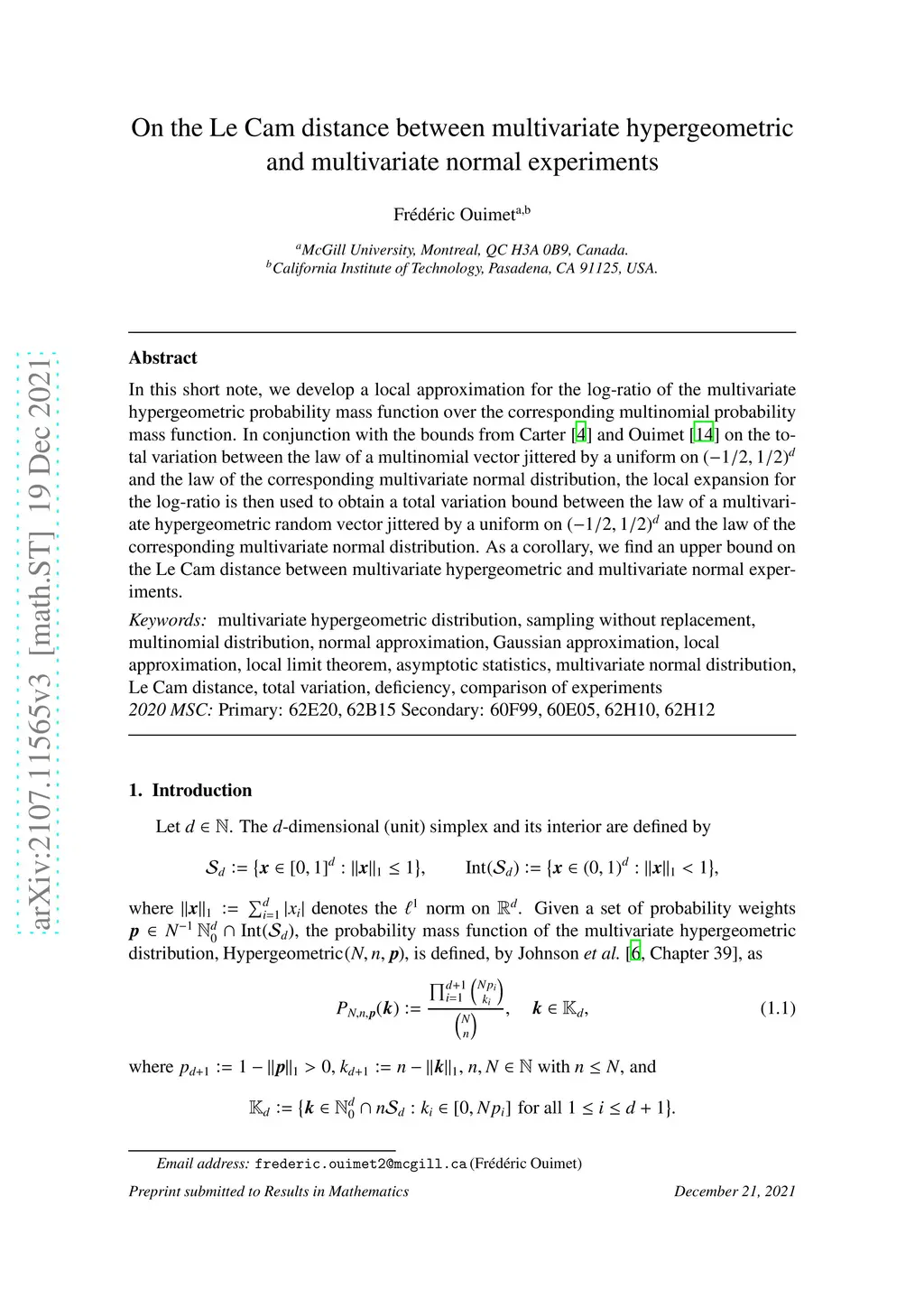 In this short note, we develop a local approximation for the log-ratio of the multivariate hypergeometric probability mass function over the corresponding multinomial probability mass function. In conjunction with the bounds from Carter (2002) and Ouimet (2021) on the total variation between the law of a multinomial vector jittered by a uniform on and the law of the corresponding multivariate normal distribution, the local expansion for the log-ratio is then used to obtain a total variation bound between the law of a multivariate hypergeometric random vector jittered by a uniform on and the law of the corresponding multivariate normal distribution. As a corollary, we find an upper bound on the Le Cam distance between multivariate hypergeometric and multivariate normal experiments.