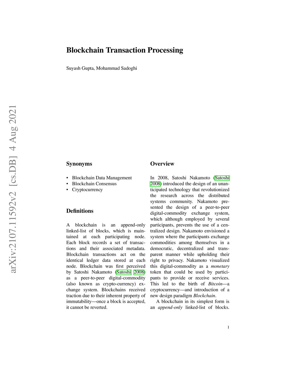A blockchain is an append-only linked-list of blocks, which is maintained at each participating node. Each block records a set of transactions and their associated metadata. Blockchain transactions act on the identical ledger data stored at each node. Blockchain was first perceived by Satoshi Nakamoto as a peer-to-peer digital-commodity (also known as crypto-currency) exchange system. Blockchains received traction due to their inherent property of immutability-once a block is accepted, it cannot be reverted.