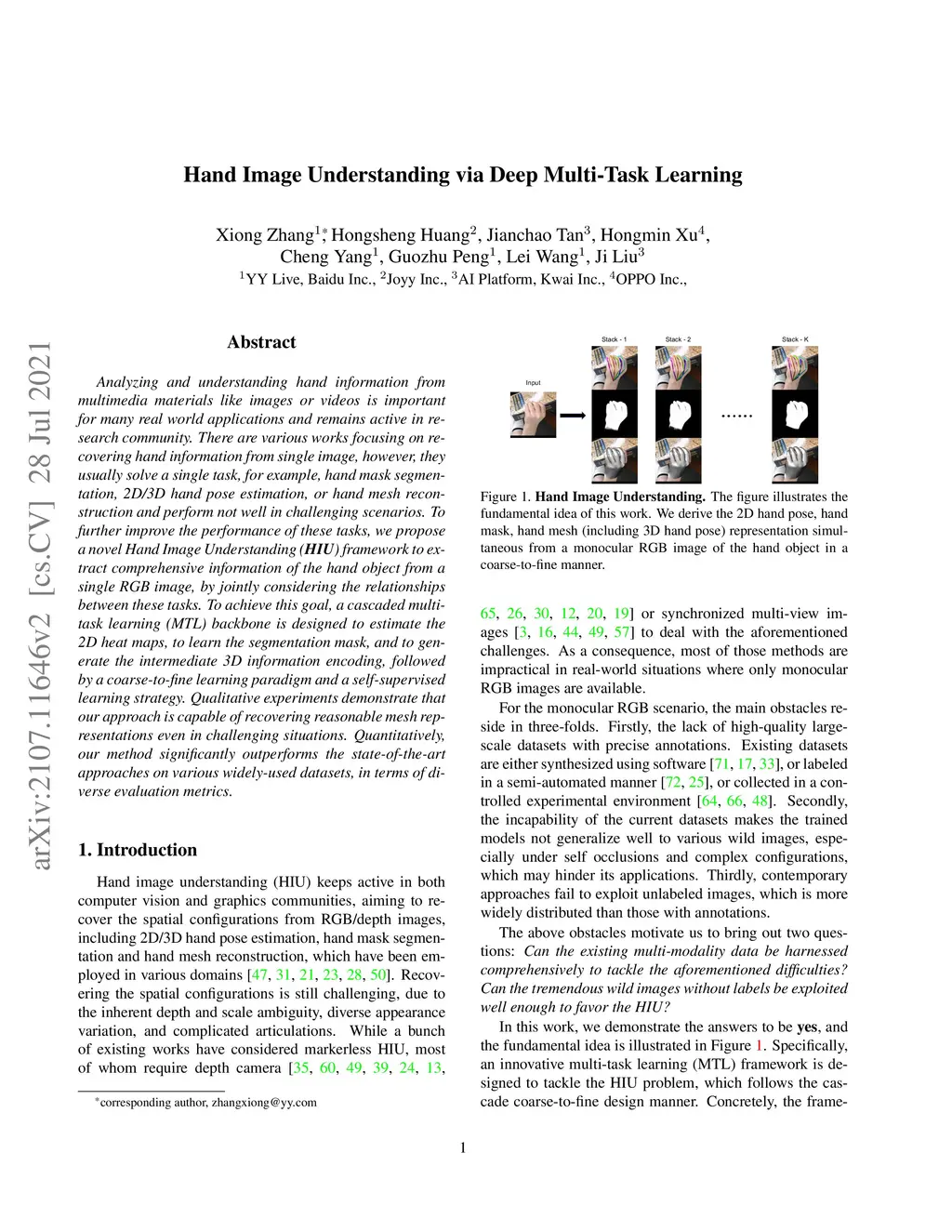 Analyzing and understanding hand information from multimedia materials like images or videos is important for many real world applications and remains active in research community. There are various works focusing on recovering hand information from single image, however, they usually solve a single task, for example, hand mask segmentation, 2D/3D hand pose estimation, or hand mesh reconstruction and perform not well in challenging scenarios. To further improve the performance of these tasks, we propose a novel Hand Image Understanding (HIU) framework to extract comprehensive information of the hand object from a single RGB image, by jointly considering the relationships between these tasks. To achieve this goal, a cascaded multi-task learning (MTL) backbone is designed to estimate the 2D heat maps, to learn the segmentation mask, and to generate the intermediate 3D information encoding, followed by a coarse-to-fine learning paradigm and a self-supervised learning strategy. Qualitative experiments demonstrate that our approach is capable of recovering reasonable mesh representations even in challenging situations. Quantitatively, our method significantly outperforms the state-of-the-art approaches on various widely-used datasets, in terms of diverse evaluation metrics.