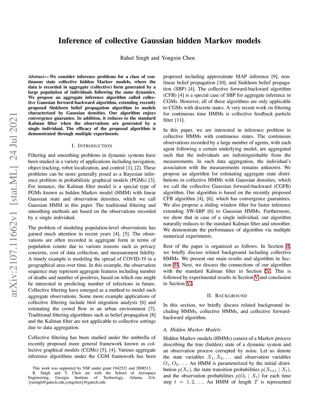 We consider inference problems for a class of continuous state collective hidden Markov models, where the data is recorded in aggregate (collective) form generated by a large population of individuals following the same dynamics. We propose an aggregate inference algorithm called collective Gaussian forward-backward algorithm, extending recently proposed Sinkhorn belief propagation algorithm to models characterized by Gaussian densities. Our algorithm enjoys convergence guarantee. In addition, it reduces to the standard Kalman filter when the observations are generated by a single individual. The efficacy of the proposed algorithm is demonstrated through multiple experiments.