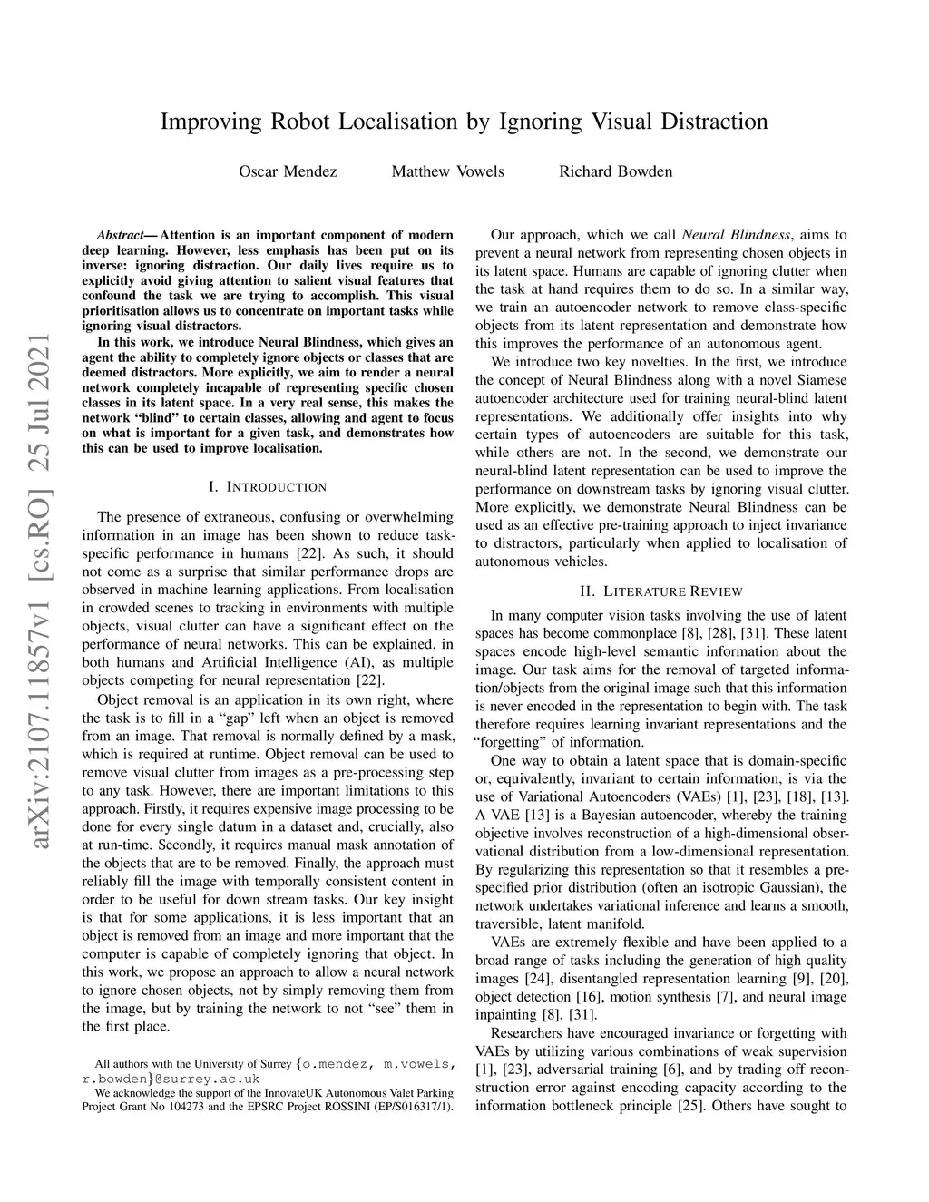 Attention is an important component of modern deep learning. However, less emphasis has been put on its inverse: ignoring distraction. Our daily lives require us to explicitly avoid giving attention to salient visual features that confound the task we are trying to accomplish. This visual prioritisation allows us to concentrate on important tasks while ignoring visual distractors. In this work, we introduce Neural Blindness, which gives an agent the ability to completely ignore objects or classes that are deemed distractors. More explicitly, we aim to render a neural network completely incapable of representing specific chosen classes in its latent space. In a very real sense, this makes the network "blind" to certain classes, allowing and agent to focus on what is important for a given task, and demonstrates how this can be used to improve localisation.