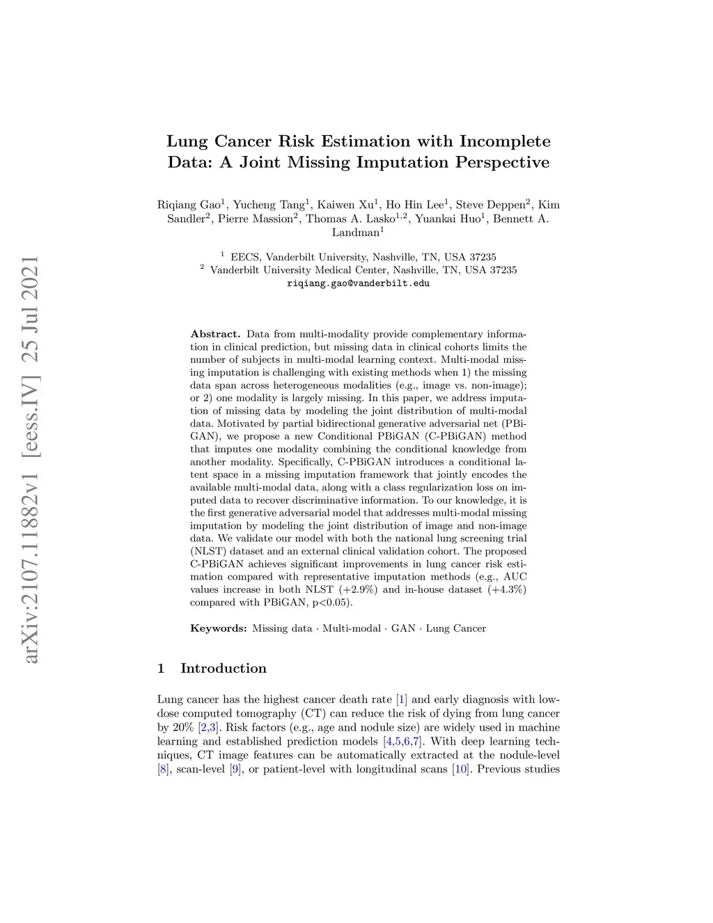 Data from multi-modality provide complementary information in clinical prediction, but missing data in clinical cohorts limits the number of subjects in multi-modal learning context. Multi-modal missing imputation is challenging with existing methods when 1) the missing data span across heterogeneous modalities (e.g., image vs. non-image); or 2) one modality is largely missing. In this paper, we address imputation of missing data by modeling the joint distribution of multi-modal data. Motivated by partial bidirectional generative adversarial net (PBiGAN), we propose a new Conditional PBiGAN (C-PBiGAN) method that imputes one modality combining the conditional knowledge from another modality. Specifically, C-PBiGAN introduces a conditional latent space in a missing imputation framework that jointly encodes the available multi-modal data, along with a class regularization loss on imputed data to recover discriminative information. To our knowledge, it is the first generative adversarial model that addresses multi-modal missing imputation by modeling the joint distribution of image and non-image data. We validate our model with both the national lung screening trial (NLST) dataset and an external clinical validation cohort. The proposed C-PBiGAN achieves significant improvements in lung cancer risk estimation compared with representative imputation methods (e.g., AUC values increase in both NLST (+2.9\%) and in-house dataset (+4.3\%) compared with PBiGAN, p0.05).