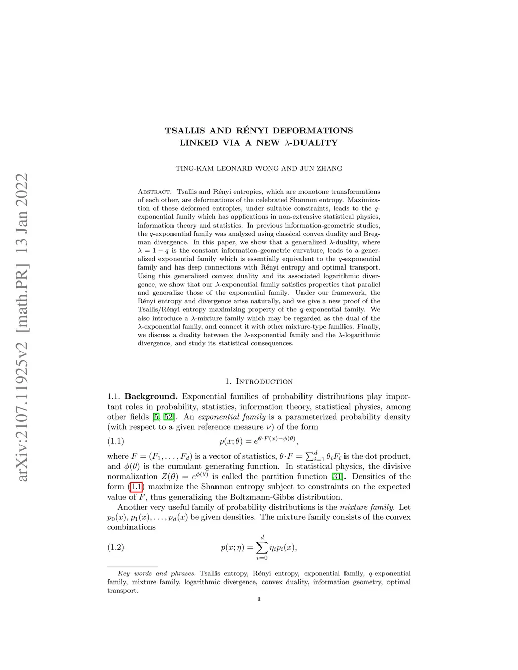 Tsallis and R\'{e}nyi entropies, which are monotone transformations of each other, are deformations of the celebrated Shannon entropy. Maximization of these deformed entropies, under suitable constraints, leads to the -exponential family which has applications in non-extensive statistical physics, information theory and statistics. In previous information-geometric studies, the -exponential family was analyzed using classical convex duality and Bregman divergence. In this paper, we show that a generalized -duality, where is the constant information-geometric curvature, leads to a generalized exponential family which is essentially equivalent to the -exponential family and has deep connections with R\'{e}nyi entropy and optimal transport. Using this generalized convex duality and its associated logarithmic divergence, we show that our -exponential family satisfies properties that parallel and generalize those of the exponential family. Under our framework, the R\'{e}nyi entropy and divergence arise naturally, and we give a new proof of the Tsallis/R\'{e}nyi entropy maximizing property of the -exponential family. We also introduce a -mixture family which may be regarded as the dual of the -exponential family, and connect it with other mixture-type families. Finally, we discuss a duality between the -exponential family and the -logarithmic divergence, and study its statistical consequences.