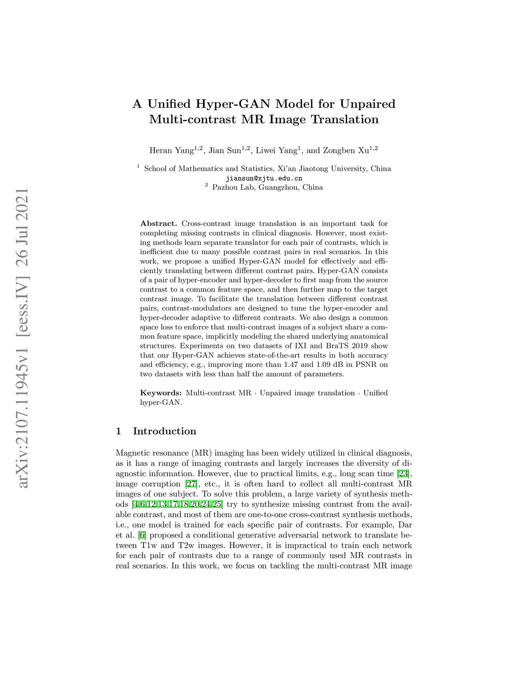 A Unified Hyper-GAN Model for Unpaired Multi-contrast MR Image