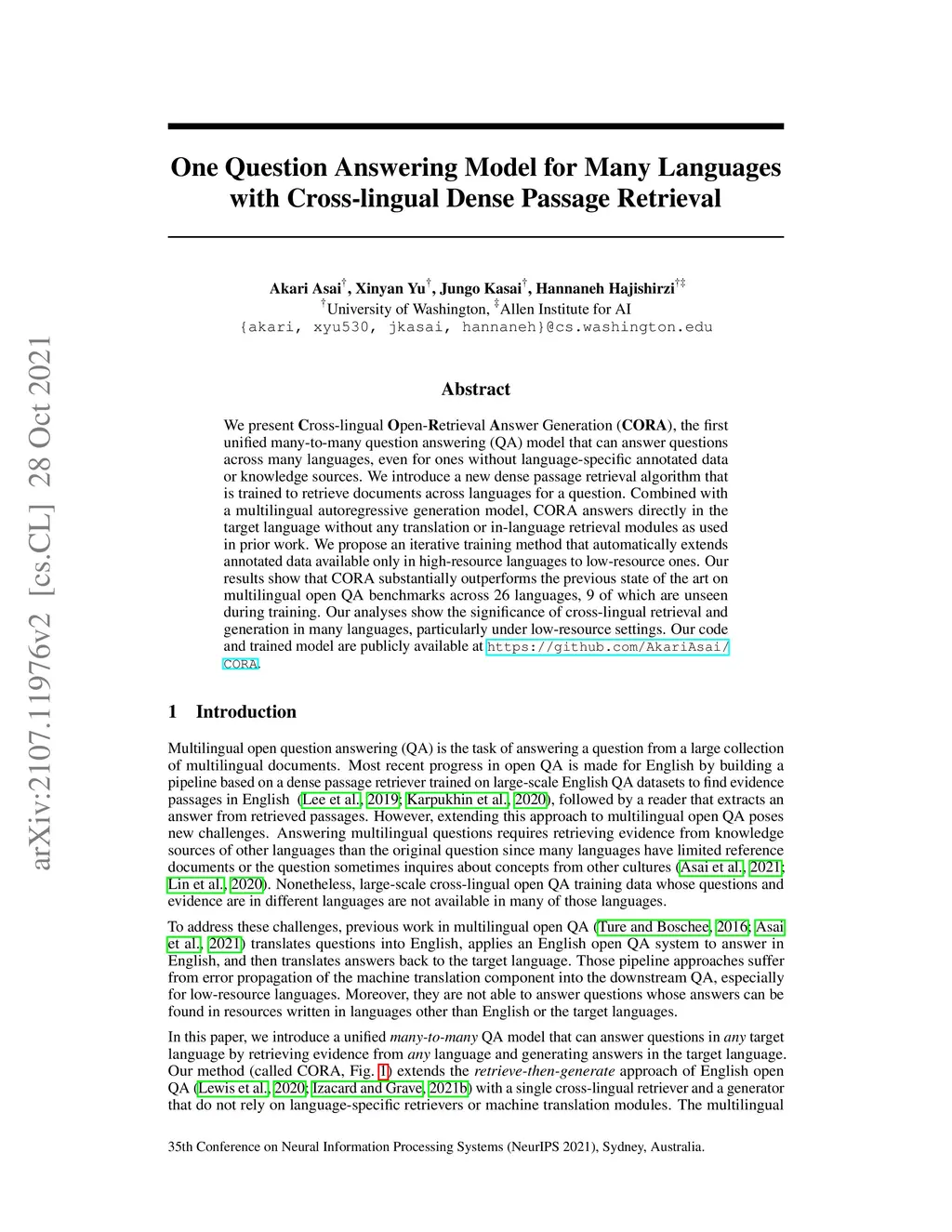 We present Cross-lingual Open-Retrieval Answer Generation (CORA), the first unified many-to-many question answering (QA) model that can answer questions across many languages, even for ones without language-specific annotated data or knowledge sources. We introduce a new dense passage retrieval algorithm that is trained to retrieve documents across languages for a question. Combined with a multilingual autoregressive generation model, CORA answers directly in the target language without any translation or in-language retrieval modules as used in prior work. We propose an iterative training method that automatically extends annotated data available only in high-resource languages to low-resource ones. Our results show that CORA substantially outperforms the previous state of the art on multilingual open QA benchmarks across 26 languages, 9 of which are unseen during training. Our analyses show the significance of cross-lingual retrieval and generation in many languages, particularly under low-resource settings.