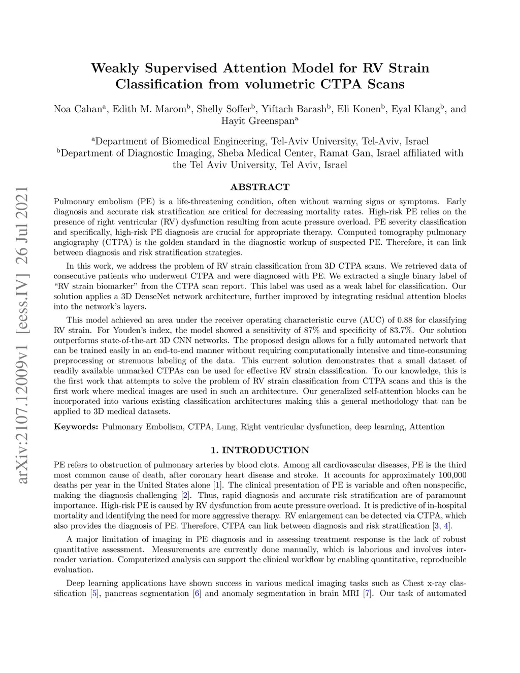 Pulmonary embolus (PE) refers to obstruction of pulmonary arteries by blood clots. PE accounts for approximately 100,000 deaths per year in the United States alone. The clinical presentation of PE is often nonspecific, making the diagnosis challenging. Thus, rapid and accurate risk stratification is of paramount importance. High-risk PE is caused by right ventricular (RV) dysfunction from acute pressure overload, which in return can help identify which patients require more aggressive therapy. Reconstructed four-chamber views of the heart on chest CT can detect right ventricular enlargement. CT pulmonary angiography (CTPA) is the golden standard in the diagnostic workup of suspected PE. Therefore, it can link between diagnosis and risk stratification strategies. We developed a weakly supervised deep learning algorithm, with an emphasis on a novel attention mechanism, to automatically classify RV strain on CTPA. Our method is a 3D DenseNet model with integrated 3D residual attention blocks. We evaluated our model on a dataset of CTPAs of emergency department (ED) PE patients. This model achieved an area under the receiver operating characteristic curve (AUC) of 0.88 for classifying RV strain. The model showed a sensitivity of 87% and specificity of 83.7%. Our solution outperforms state-of-the-art 3D CNN networks. The proposed design allows for a fully automated network that can be trained easily in an end-to-end manner without requiring computationally intensive and time-consuming preprocessing or strenuous labeling of the data.We infer that unmarked CTPAs can be used for effective RV strain classification. This could be used as a second reader, alerting for high-risk PE patients. To the best of our knowledge, there are no previous deep learning-based studies that attempted to solve this problem.
