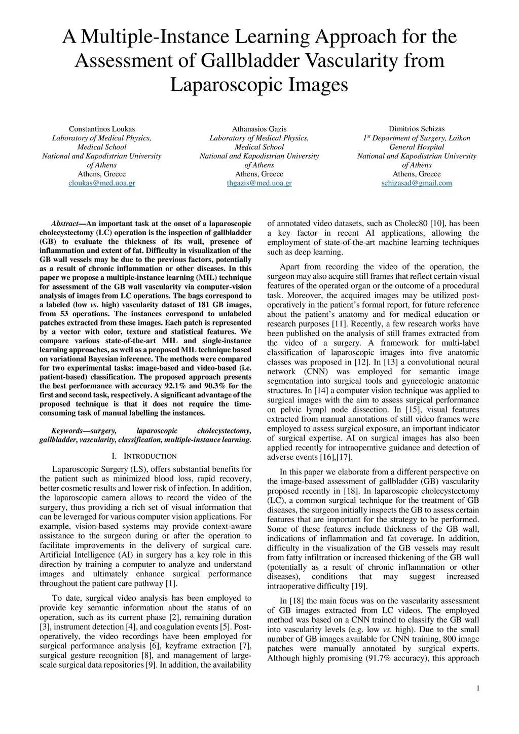 An important task at the onset of a laparoscopic cholecystectomy (LC) operation is the inspection of gallbladder (GB) to evaluate the thickness of its wall, presence of inflammation and extent of fat. Difficulty in visualization of the GB wall vessels may be due to the previous factors, potentially as a result of chronic inflammation or other diseases. In this paper we propose a multiple-instance learning (MIL) technique for assessment of the GB wall vascularity via computer-vision analysis of images from LC operations. The bags correspond to a labeled (low vs. high) vascularity dataset of 181 GB images, from 53 operations. The instances correspond to unlabeled patches extracted from these images. Each patch is represented by a vector with color, texture and statistical features. We compare various state-of-the-art MIL and single-instance learning approaches, as well as a proposed MIL technique based on variational Bayesian inference. The methods were compared for two experimental tasks: image-based and video-based (i.e. patient-based) classification. The proposed approach presents the best performance with accuracy 92.1% and 90.3% for the first and second task, respectively. A significant advantage of the proposed technique is that it does not require the time-consuming task of manual labelling the instances.