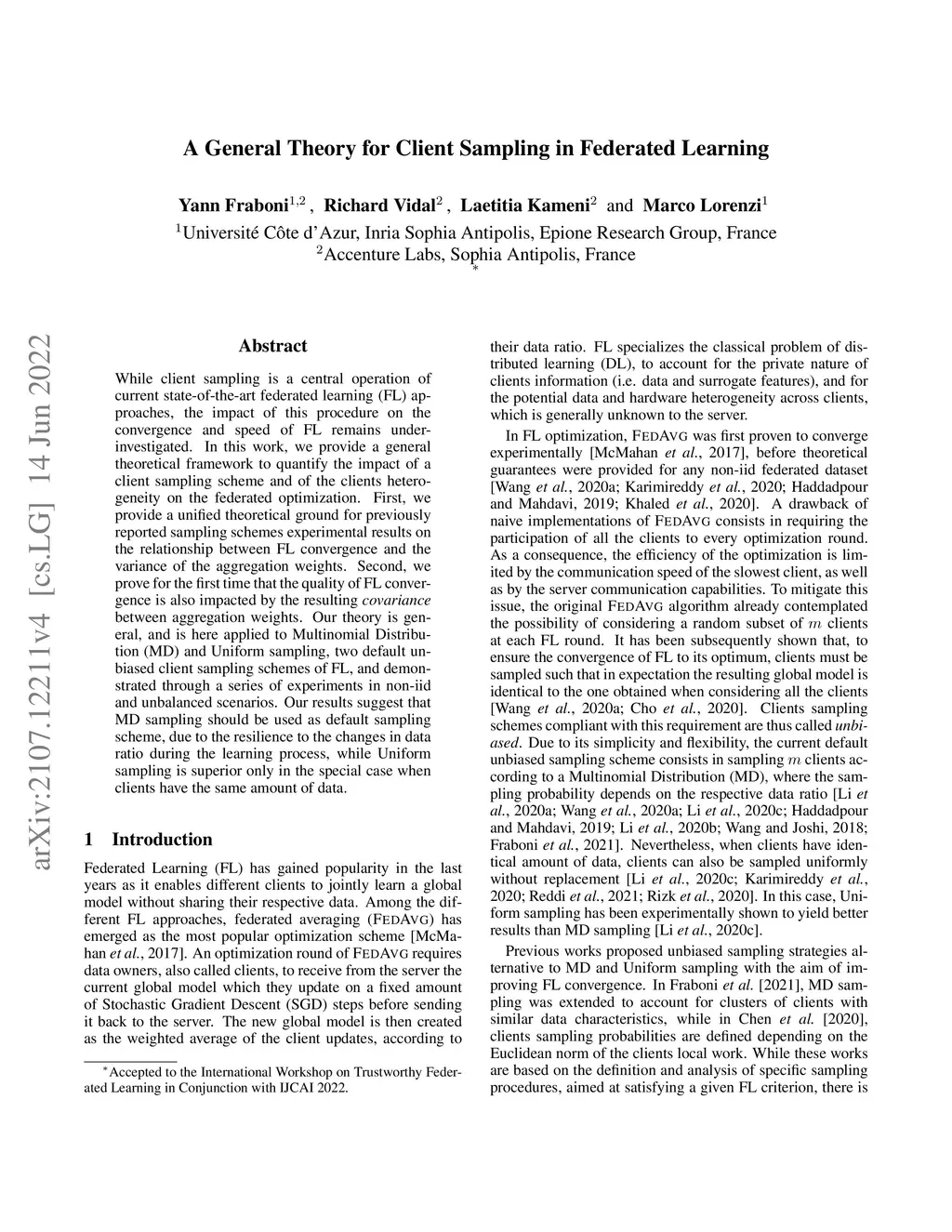 While client sampling is a central operation of current state-of-the-art federated learning (FL) approaches, the impact of this procedure on the convergence and speed of FL remains under-investigated. In this work, we provide a general theoretical framework to quantify the impact of a client sampling scheme and of the clients heterogeneity on the federated optimization. First, we provide a unified theoretical ground for previously reported sampling schemes experimental results on the relationship between FL convergence and the variance of the aggregation weights. Second, we prove for the first time that the quality of FL convergence is also impacted by the resulting covariance between aggregation weights. Our theory is general, and is here applied to Multinomial Distribution (MD) and Uniform sampling, two default unbiased client sampling schemes of FL, and demonstrated through a series of experiments in non-iid and unbalanced scenarios. Our results suggest that MD sampling should be used as default sampling scheme, due to the resilience to the changes in data ratio during the learning process, while Uniform sampling is superior only in the special case when clients have the same amount of data.