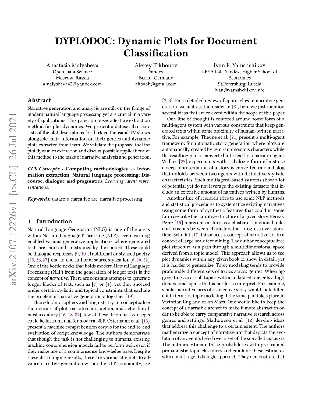 Narrative generation and analysis are still on the fringe of modern natural language processing yet are crucial in a variety of applications. This paper proposes a feature extraction method for plot dynamics. We present a dataset that consists of the plot descriptions for thirteen thousand TV shows alongside meta-information on their genres and dynamic plots extracted from them. We validate the proposed tool for plot dynamics extraction and discuss possible applications of this method to the tasks of narrative analysis and generation.