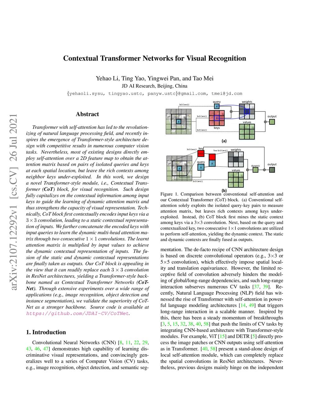 Transformer with self-attention has led to the revolutionizing of natural language processing field, and recently inspires the emergence of Transformer-style architecture design with competitive results in numerous computer vision tasks. Nevertheless, most of existing designs directly employ self-attention over a 2D feature map to obtain the attention matrix based on pairs of isolated queries and keys at each spatial location, but leave the rich contexts among neighbor keys under-exploited. In this work, we design a novel Transformer-style module, i.e., Contextual Transformer (CoT) block, for visual recognition. Such design fully capitalizes on the contextual information among input keys to guide the learning of dynamic attention matrix and thus strengthens the capacity of visual representation. Technically, CoT block first contextually encodes input keys via a convolution, leading to a static contextual representation of inputs. We further concatenate the encoded keys with input queries to learn the dynamic multi-head attention matrix through two consecutive convolutions. The learnt attention matrix is multiplied by input values to achieve the dynamic contextual representation of inputs. The fusion of the static and dynamic contextual representations are finally taken as outputs. Our CoT block is appealing in the view that it can readily replace each convolution in ResNet architectures, yielding a Transformer-style backbone named as Contextual Transformer Networks (CoTNet). Through extensive experiments over a wide range of applications (e.g., image recognition, object detection and instance segmentation), we validate the superiority of CoTNet as a stronger backbone. Source code is available at \url{https://github.com/JDAI-CV/CoTNet}.