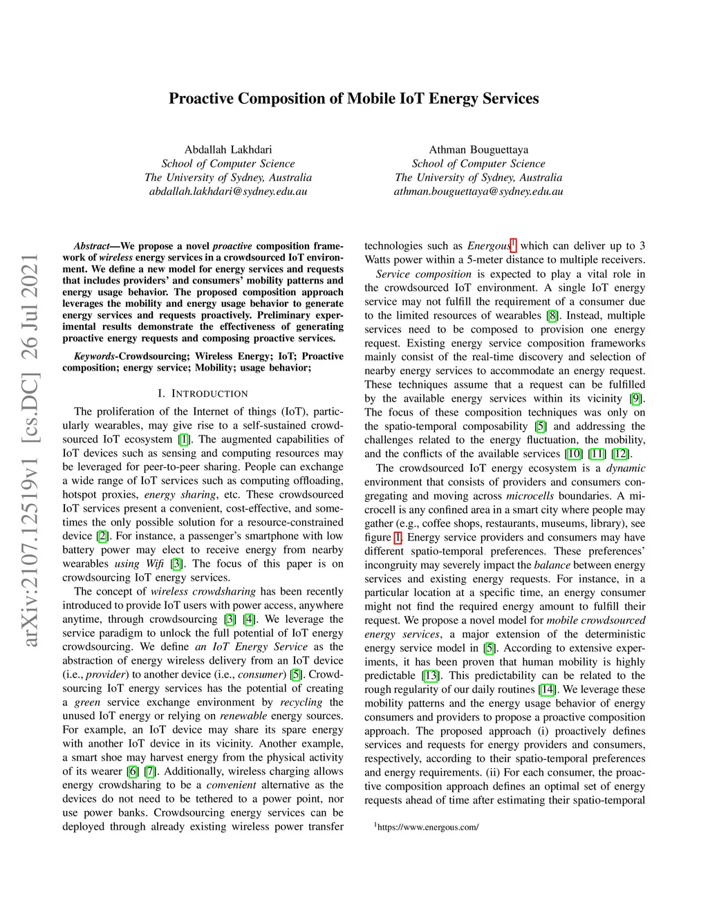 We propose a novel proactive composition framework of wireless energy services in a crowdsourced IoT environment. We define a new model for energy services and requests that includes providers' and consumers' mobility patterns and energy usage behavior. The proposed composition approach leverages the mobility and energy usage behavior to generate energy services and requests proactively. Preliminary experimental results demonstrate the effectiveness of generating proactive energy requests and composing proactive services.