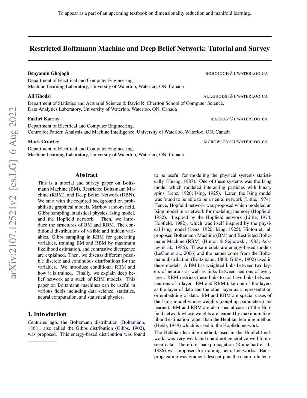 This is a tutorial and survey paper on Boltzmann Machine (BM), Restricted Boltzmann Machine (RBM), and Deep Belief Network (DBN). We start with the required background on probabilistic graphical models, Markov random field, Gibbs sampling, statistical physics, Ising model, and the Hopfield network. Then, we introduce the structures of BM and RBM. The conditional distributions of visible and hidden variables, Gibbs sampling in RBM for generating variables, training BM and RBM by maximum likelihood estimation, and contrastive divergence are explained. Then, we discuss different possible discrete and continuous distributions for the variables. We introduce conditional RBM and how it is trained. Finally, we explain deep belief network as a stack of RBM models. This paper on Boltzmann machines can be useful in various fields including data science, statistics, neural computation, and statistical physics.
