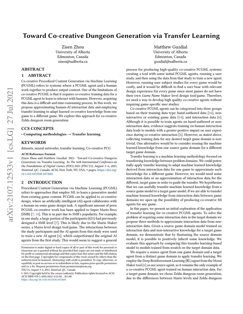 Toward Co-creative Dungeon Generation via Transfer Learning