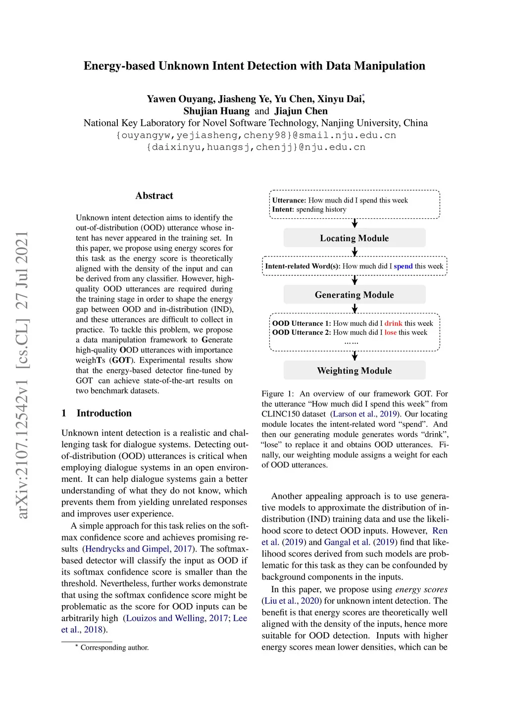 Unknown intent detection aims to identify the out-of-distribution (OOD) utterance whose intent has never appeared in the training set. In this paper, we propose using energy scores for this task as the energy score is theoretically aligned with the density of the input and can be derived from any classifier. However, high-quality OOD utterances are required during the training stage in order to shape the energy gap between OOD and in-distribution (IND), and these utterances are difficult to collect in practice. To tackle this problem, we propose a data manipulation framework to Generate high-quality OOD utterances with importance weighTs (GOT). Experimental results show that the energy-based detector fine-tuned by GOT can achieve state-of-the-art results on two benchmark datasets.