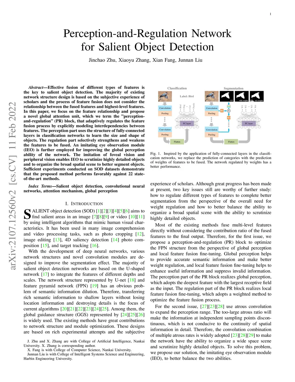 Effective fusion of different types of features is the key to salient object detection. The majority of existing network structure design is based on the subjective experience of scholars and the process of feature fusion does not consider the relationship between the fused features and highest-level features. In this paper, we focus on the feature relationship and propose a novel global attention unit, which we term the "perception- and-regulation" (PR) block, that adaptively regulates the feature fusion process by explicitly modeling interdependencies between features. The perception part uses the structure of fully-connected layers in classification networks to learn the size and shape of objects. The regulation part selectively strengthens and weakens the features to be fused. An imitating eye observation module (IEO) is further employed for improving the global perception ability of the network. The imitation of foveal vision and peripheral vision enables IEO to scrutinize highly detailed objects and to organize the broad spatial scene to better segment objects. Sufficient experiments conducted on SOD datasets demonstrate that the proposed method performs favorably against 22 state-of-the-art methods.