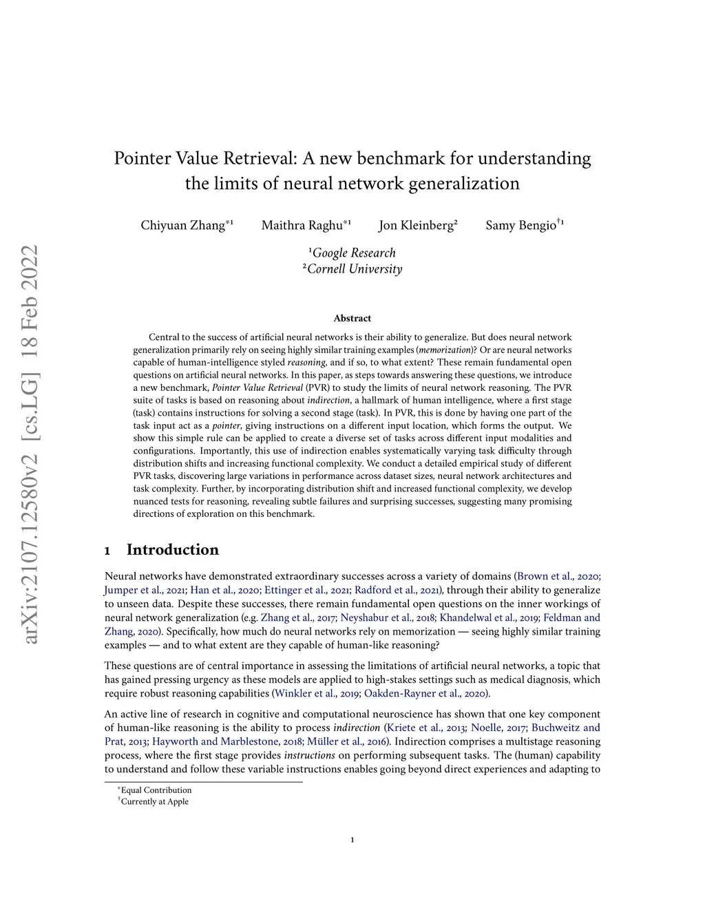 Central to the success of artificial neural networks is their ability to generalize. But does neural network generalization primarily rely on seeing highly similar training examples (memorization)? Or are neural networks capable of human-intelligence styled reasoning, and if so, to what extent? These remain fundamental open questions on artificial neural networks. In this paper, as steps towards answering these questions, we introduce a new benchmark, Pointer Value Retrieval (PVR) to study the limits of neural network reasoning. The PVR suite of tasks is based on reasoning about indirection, a hallmark of human intelligence, where a first stage (task) contains instructions for solving a second stage (task). In PVR, this is done by having one part of the task input act as a pointer, giving instructions on a different input location, which forms the output. We show this simple rule can be applied to create a diverse set of tasks across different input modalities and configurations. Importantly, this use of indirection enables systematically varying task difficulty through distribution shifts and increasing functional complexity. We conduct a detailed empirical study of different PVR tasks, discovering large variations in performance across dataset sizes, neural network architectures and task complexity. Further, by incorporating distribution shift and increased functional complexity, we develop nuanced tests for reasoning, revealing subtle failures and surprising successes, suggesting many promising directions of exploration on this benchmark.