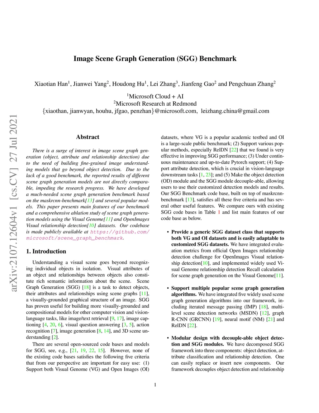 There is a surge of interest in image scene graph generation (object, attribute and relationship detection) due to the need of building fine-grained image understanding models that go beyond object detection. Due to the lack of a good benchmark, the reported results of different scene graph generation models are not directly comparable, impeding the research progress. We have developed a much-needed scene graph generation benchmark based on the maskrcnn-benchmark and several popular models. This paper presents main features of our benchmark and a comprehensive ablation study of scene graph generation models using the Visual Genome and OpenImages Visual relationship detection datasets. Our codebase is made publicly available at https://github.com/microsoft/scene_graph_benchmark.