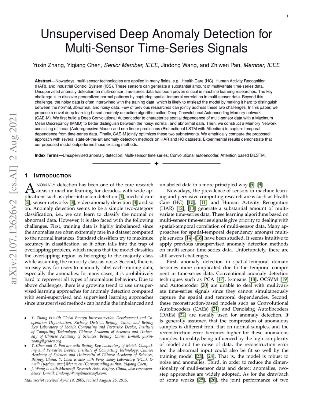 Nowadays, multi-sensor technologies are applied in many fields, e.g., Health Care (HC), Human Activity Recognition (HAR), and Industrial Control System (ICS). These sensors can generate a substantial amount of multivariate time-series data. Unsupervised anomaly detection on multi-sensor time-series data has been proven critical in machine learning researches. The key challenge is to discover generalized normal patterns by capturing spatial-temporal correlation in multi-sensor data. Beyond this challenge, the noisy data is often intertwined with the training data, which is likely to mislead the model by making it hard to distinguish between the normal, abnormal, and noisy data. Few of previous researches can jointly address these two challenges. In this paper, we propose a novel deep learning-based anomaly detection algorithm called Deep Convolutional Autoencoding Memory network (CAE-M). We first build a Deep Convolutional Autoencoder to characterize spatial dependence of multi-sensor data with a Maximum Mean Discrepancy (MMD) to better distinguish between the noisy, normal, and abnormal data. Then, we construct a Memory Network consisting of linear (Autoregressive Model) and non-linear predictions (Bidirectional LSTM with Attention) to capture temporal dependence from time-series data. Finally, CAE-M jointly optimizes these two subnetworks. We empirically compare the proposed approach with several state-of-the-art anomaly detection methods on HAR and HC datasets. Experimental results demonstrate that our proposed model outperforms these existing methods.