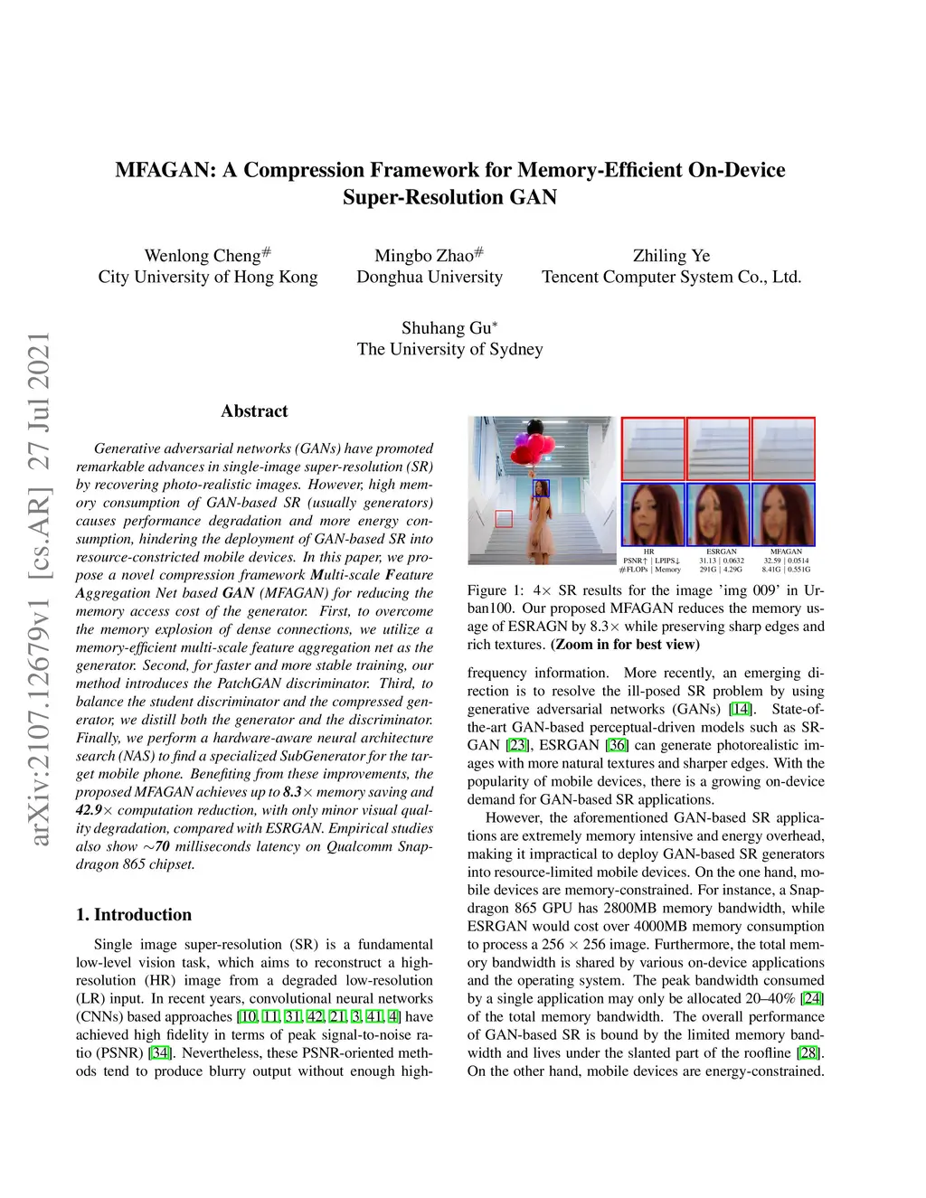 Generative adversarial networks (GANs) have promoted remarkable advances in single-image super-resolution (SR) by recovering photo-realistic images. However, high memory consumption of GAN-based SR (usually generators) causes performance degradation and more energy consumption, hindering the deployment of GAN-based SR into resource-constricted mobile devices. In this paper, we propose a novel compression framework \textbf{M}ulti-scale \textbf{F}eature \textbf{A}ggregation Net based \textbf{GAN} (MFAGAN) for reducing the memory access cost of the generator. First, to overcome the memory explosion of dense connections, we utilize a memory-efficient multi-scale feature aggregation net as the generator. Second, for faster and more stable training, our method introduces the PatchGAN discriminator. Third, to balance the student discriminator and the compressed generator, we distill both the generator and the discriminator. Finally, we perform a hardware-aware neural architecture search (NAS) to find a specialized SubGenerator for the target mobile phone. Benefiting from these improvements, the proposed MFAGAN achieves up to \textbf{8.3} memory saving and \textbf{42.9} computation reduction, with only minor visual quality degradation, compared with ESRGAN. Empirical studies also show \textbf{70} milliseconds latency on Qualcomm Snapdragon 865 chipset.