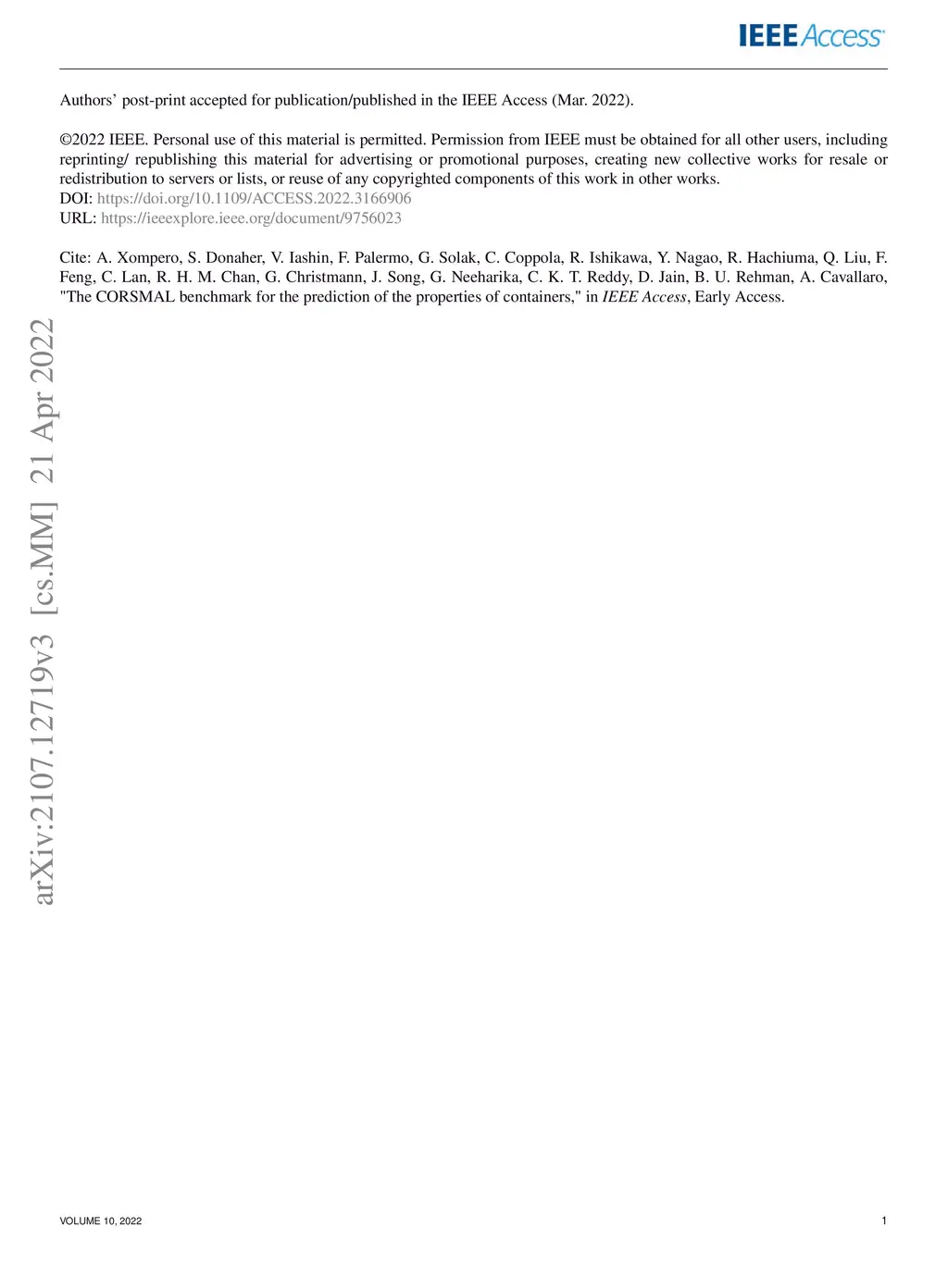 The CORSMAL benchmark for the prediction of the properties of containers