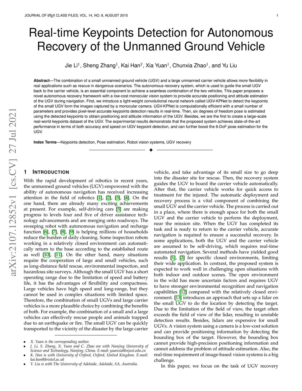 The combination of a small unmanned ground vehicle (UGV) and a large unmanned carrier vehicle allows more flexibility in real applications such as rescue in dangerous scenarios. The autonomous recovery system, which is used to guide the small UGV back to the carrier vehicle, is an essential component to achieve a seamless combination of the two vehicles. This paper proposes a novel autonomous recovery framework with a low-cost monocular vision system to provide accurate positioning and attitude estimation of the UGV during navigation. First, we introduce a light-weight convolutional neural network called UGV-KPNet to detect the keypoints of the small UGV from the images captured by a monocular camera. UGV-KPNet is computationally efficient with a small number of parameters and provides pixel-level accurate keypoints detection results in real-time. Then, six degrees of freedom pose is estimated using the detected keypoints to obtain positioning and attitude information of the UGV. Besides, we are the first to create a large-scale real-world keypoints dataset of the UGV. The experimental results demonstrate that the proposed system achieves state-of-the-art performance in terms of both accuracy and speed on UGV keypoint detection, and can further boost the 6-DoF pose estimation for the UGV.