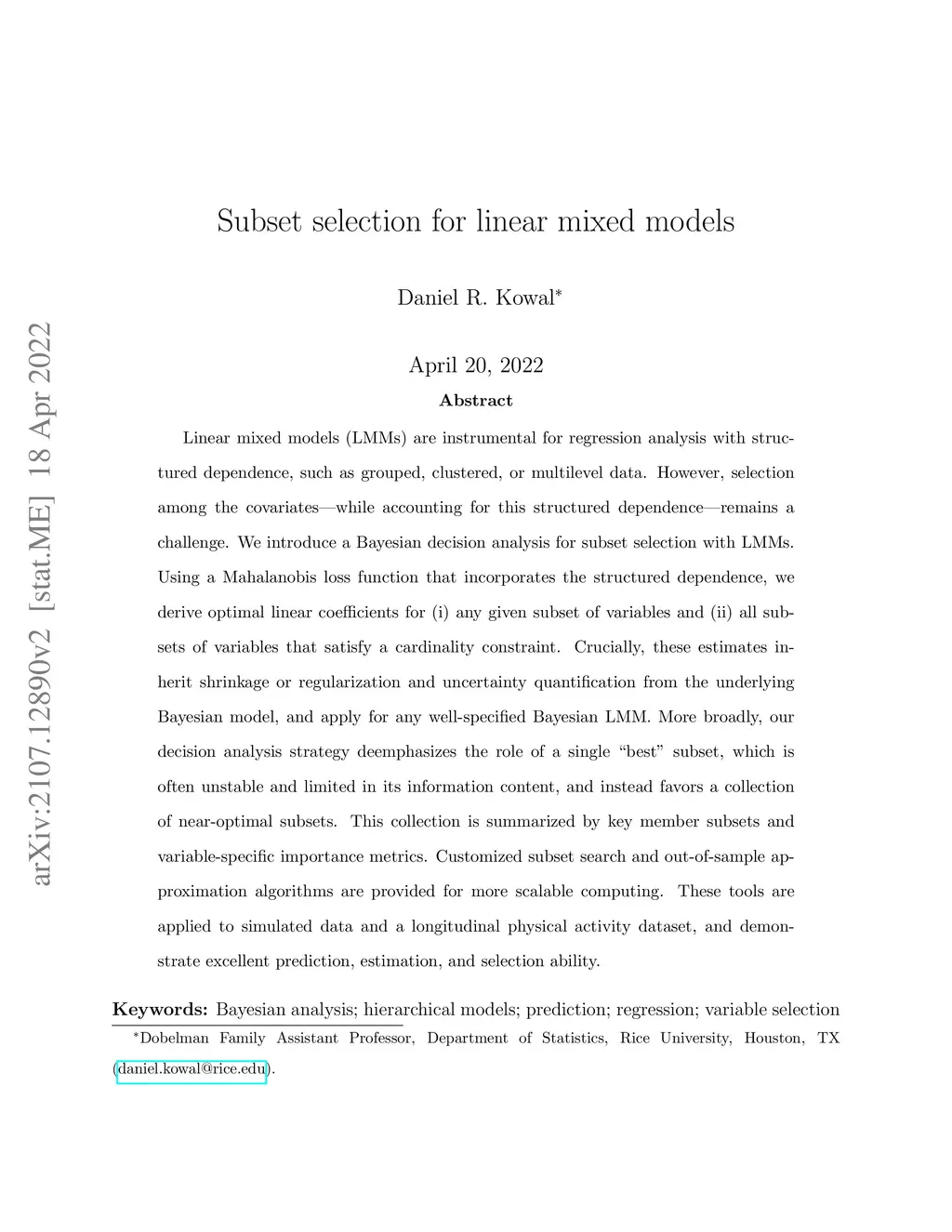 Linear mixed models (LMMs) are instrumental for regression analysis with structured dependence, such as grouped, clustered, or multilevel data. However, selection among the covariates--while accounting for this structured dependence--remains a challenge. We introduce a Bayesian decision analysis for subset selection with LMMs. Using a Mahalanobis loss function that incorporates the structured dependence, we derive optimal linear coefficients for (i) any given subset of variables and (ii) all subsets of variables that satisfy a cardinality constraint. Crucially, these estimates inherit shrinkage or regularization and uncertainty quantification from the underlying Bayesian model, and apply for any well-specified Bayesian LMM. More broadly, our decision analysis strategy deemphasizes the role of a single "best" subset, which is often unstable and limited in its information content, and instead favors a collection of near-optimal subsets. This collection is summarized by key member subsets and variable-specific importance metrics. Customized subset search and out-of-sample approximation algorithms are provided for more scalable computing. These tools are applied to simulated data and a longitudinal physical activity dataset, and demonstrate excellent prediction, estimation, and selection ability.