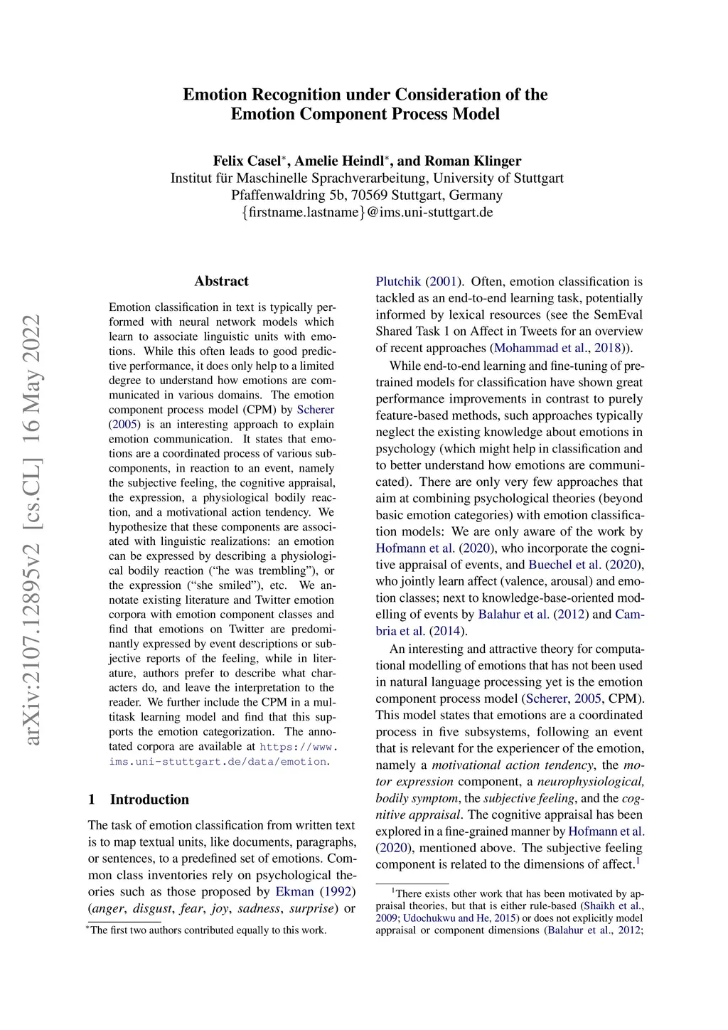 Emotion Recognition under Consideration of the Emotion Component Process