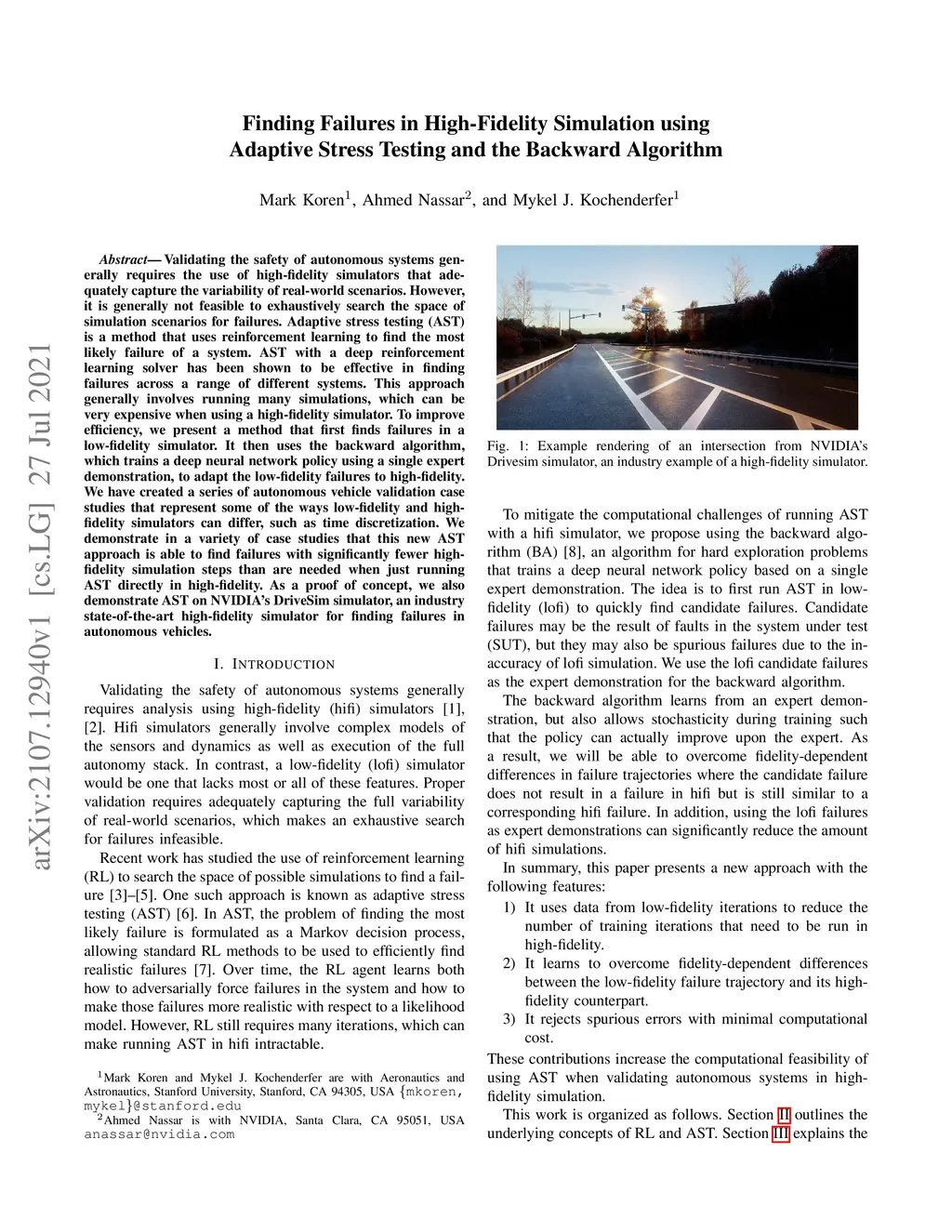 Validating the safety of autonomous systems generally requires the use of high-fidelity simulators that adequately capture the variability of real-world scenarios. However, it is generally not feasible to exhaustively search the space of simulation scenarios for failures. Adaptive stress testing (AST) is a method that uses reinforcement learning to find the most likely failure of a system. AST with a deep reinforcement learning solver has been shown to be effective in finding failures across a range of different systems. This approach generally involves running many simulations, which can be very expensive when using a high-fidelity simulator. To improve efficiency, we present a method that first finds failures in a low-fidelity simulator. It then uses the backward algorithm, which trains a deep neural network policy using a single expert demonstration, to adapt the low-fidelity failures to high-fidelity. We have created a series of autonomous vehicle validation case studies that represent some of the ways low-fidelity and high-fidelity simulators can differ, such as time discretization. We demonstrate in a variety of case studies that this new AST approach is able to find failures with significantly fewer high-fidelity simulation steps than are needed when just running AST directly in high-fidelity. As a proof of concept, we also demonstrate AST on NVIDIA's DriveSim simulator, an industry state-of-the-art high-fidelity simulator for finding failures in autonomous vehicles.