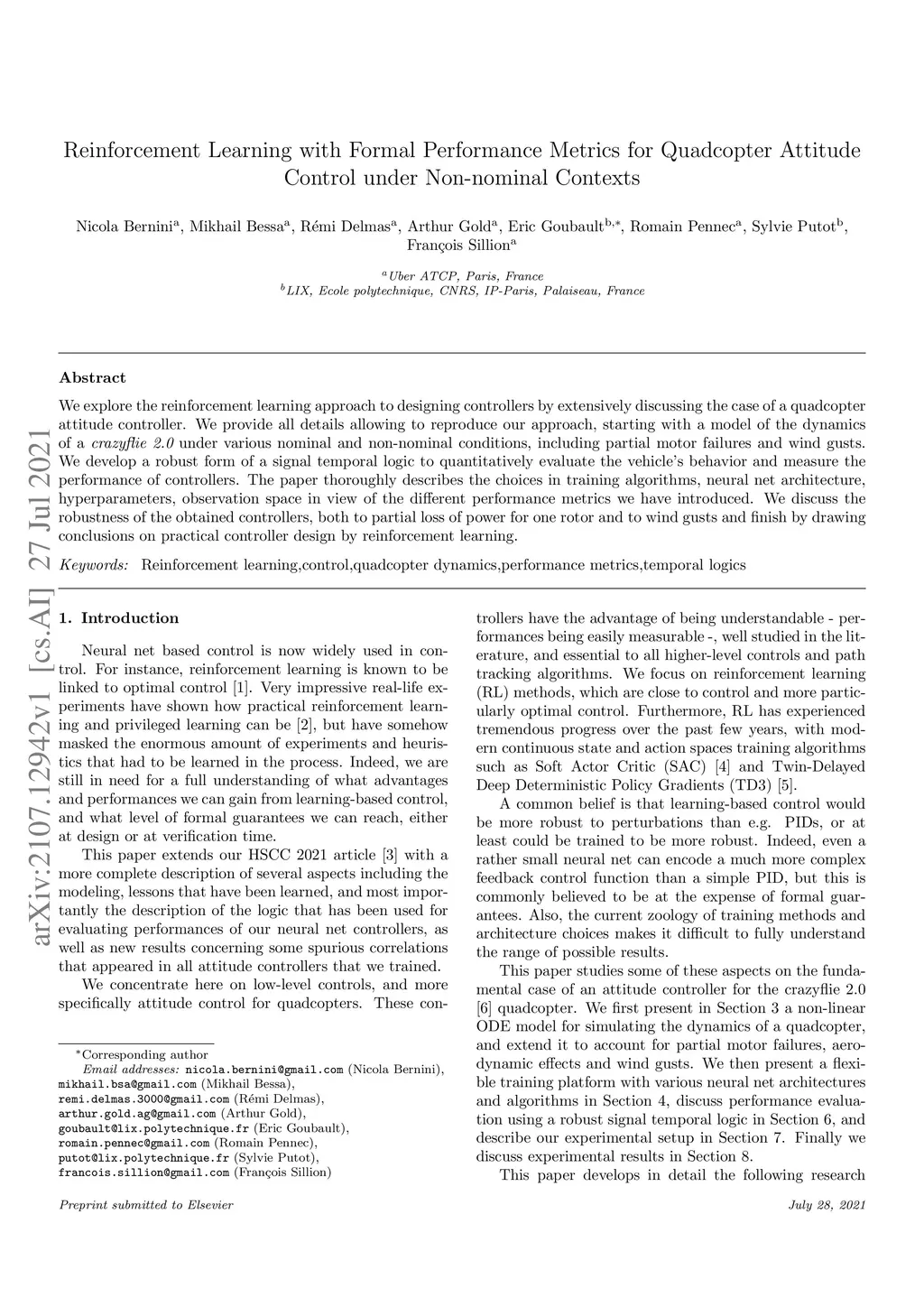 Reinforcement Learning with Formal Performance Metrics for Quadcopter