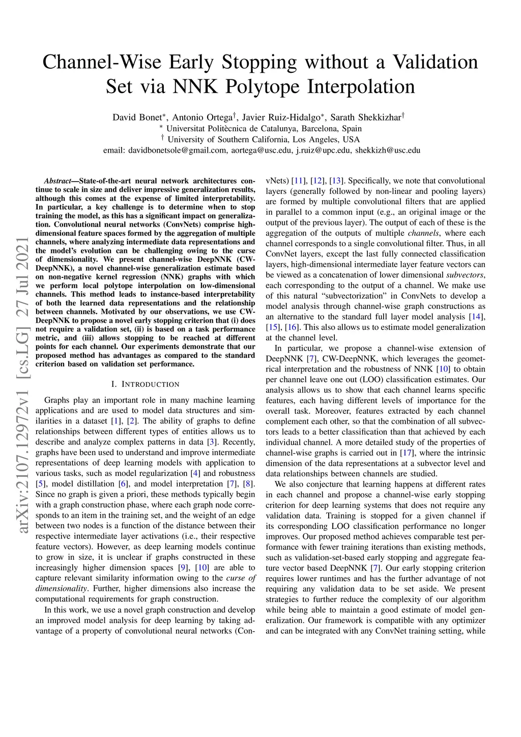 State-of-the-art neural network architectures continue to scale in size and deliver impressive generalization results, although this comes at the expense of limited interpretability. In particular, a key challenge is to determine when to stop training the model, as this has a significant impact on generalization. Convolutional neural networks (ConvNets) comprise high-dimensional feature spaces formed by the aggregation of multiple channels, where analyzing intermediate data representations and the model's evolution can be challenging owing to the curse of dimensionality. We present channel-wise DeepNNK (CW-DeepNNK), a novel channel-wise generalization estimate based on non-negative kernel regression (NNK) graphs with which we perform local polytope interpolation on low-dimensional channels. This method leads to instance-based interpretability of both the learned data representations and the relationship between channels. Motivated by our observations, we use CW-DeepNNK to propose a novel early stopping criterion that (i) does not require a validation set, (ii) is based on a task performance metric, and (iii) allows stopping to be reached at different points for each channel. Our experiments demonstrate that our proposed method has advantages as compared to the standard criterion based on validation set performance.