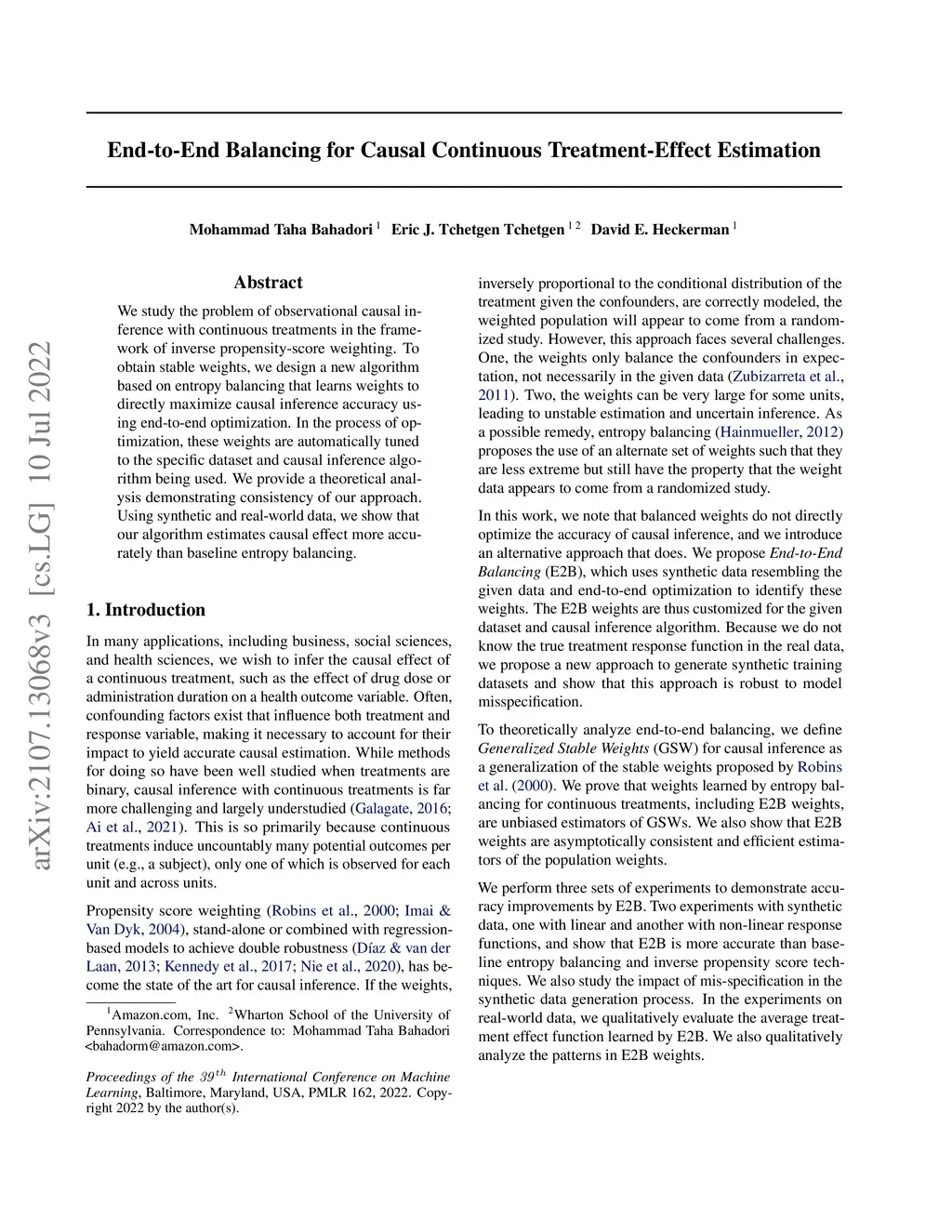 We study the problem of observational causal inference with continuous treatment. We focus on the challenge of estimating the causal response curve for infrequently-observed treatment values. We design a new algorithm based on the framework of entropy balancing which learns weights that directly maximize causal inference accuracy using end-to-end optimization. Our weights can be customized for different datasets and causal inference algorithms. We propose a new theory for consistency of entropy balancing for continuous treatments. Using synthetic and real-world data, we show that our proposed algorithm outperforms the entropy balancing in terms of causal inference accuracy.