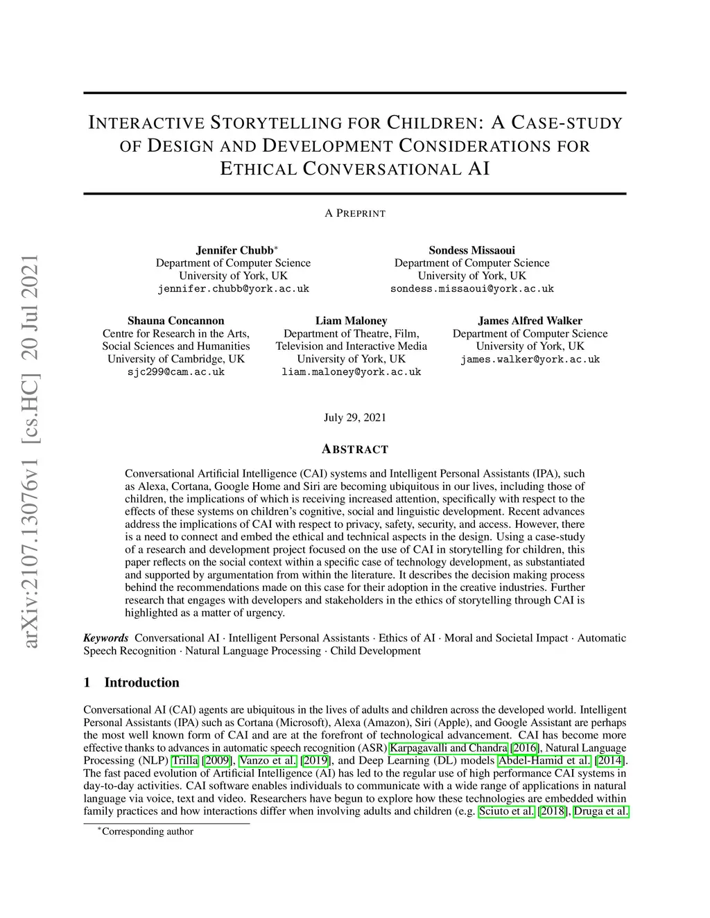 Conversational Artificial Intelligence (CAI) systems and Intelligent Personal Assistants (IPA), such as Alexa, Cortana, Google Home and Siri are becoming ubiquitous in our lives, including those of children, the implications of which is receiving increased attention, specifically with respect to the effects of these systems on children's cognitive, social and linguistic development. Recent advances address the implications of CAI with respect to privacy, safety, security, and access. However, there is a need to connect and embed the ethical and technical aspects in the design. Using a case-study of a research and development project focused on the use of CAI in storytelling for children, this paper reflects on the social context within a specific case of technology development, as substantiated and supported by argumentation from within the literature. It describes the decision making process behind the recommendations made on this case for their adoption in the creative industries. Further research that engages with developers and stakeholders in the ethics of storytelling through CAI is highlighted as a matter of urgency.