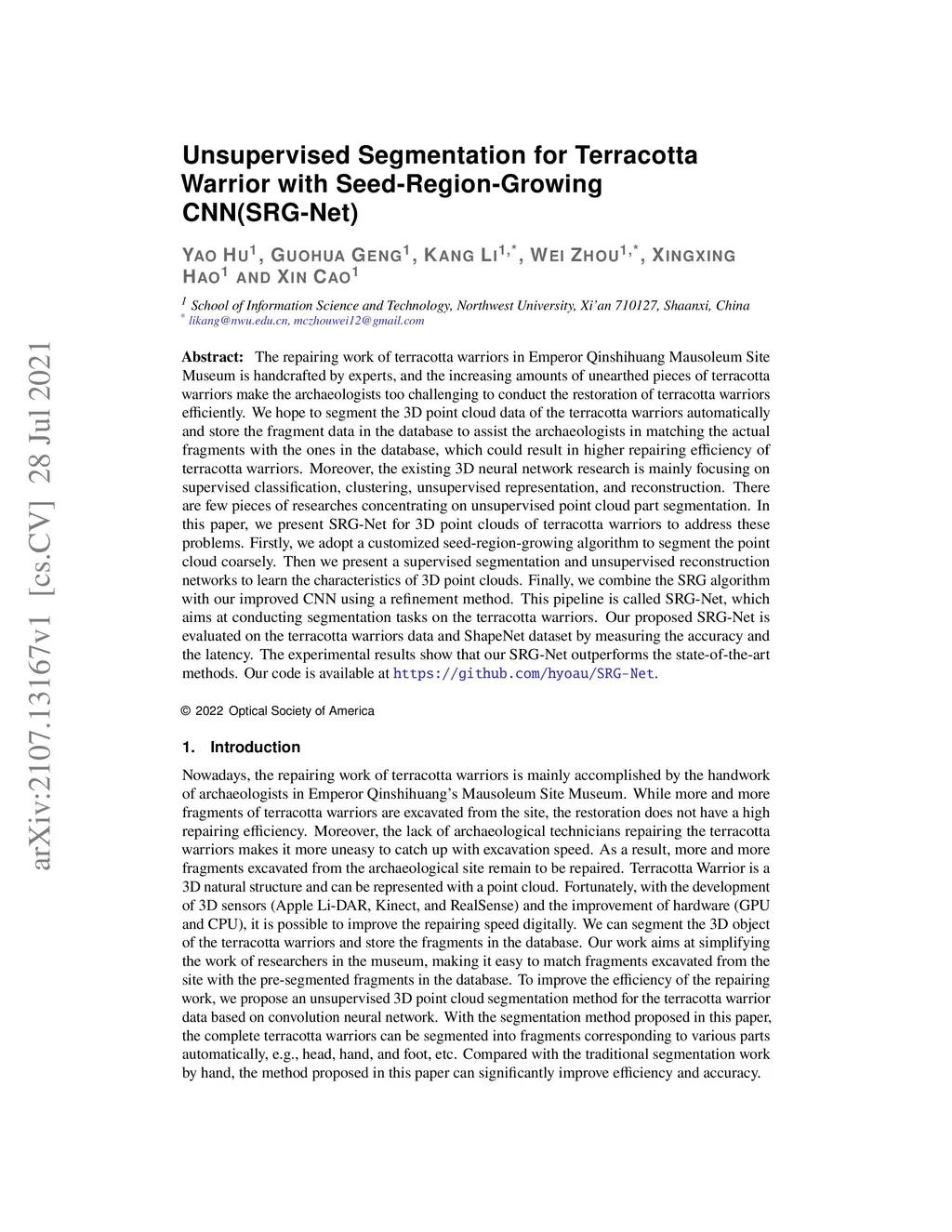 The repairing work of terracotta warriors in Emperor Qinshihuang Mausoleum Site Museum is handcrafted by experts, and the increasing amounts of unearthed pieces of terracotta warriors make the archaeologists too challenging to conduct the restoration of terracotta warriors efficiently. We hope to segment the 3D point cloud data of the terracotta warriors automatically and store the fragment data in the database to assist the archaeologists in matching the actual fragments with the ones in the database, which could result in higher repairing efficiency of terracotta warriors. Moreover, the existing 3D neural network research is mainly focusing on supervised classification, clustering, unsupervised representation, and reconstruction. There are few pieces of researches concentrating on unsupervised point cloud part segmentation. In this paper, we present SRG-Net for 3D point clouds of terracotta warriors to address these problems. Firstly, we adopt a customized seed-region-growing algorithm to segment the point cloud coarsely. Then we present a supervised segmentation and unsupervised reconstruction networks to learn the characteristics of 3D point clouds. Finally, we combine the SRG algorithm with our improved CNN using a refinement method. This pipeline is called SRG-Net, which aims at conducting segmentation tasks on the terracotta warriors. Our proposed SRG-Net is evaluated on the terracotta warriors data and ShapeNet dataset by measuring the accuracy and the latency. The experimental results show that our SRG-Net outperforms the state-of-the-art methods. Our code is shown in Code File 1~\cite{Srgnet_2021}.