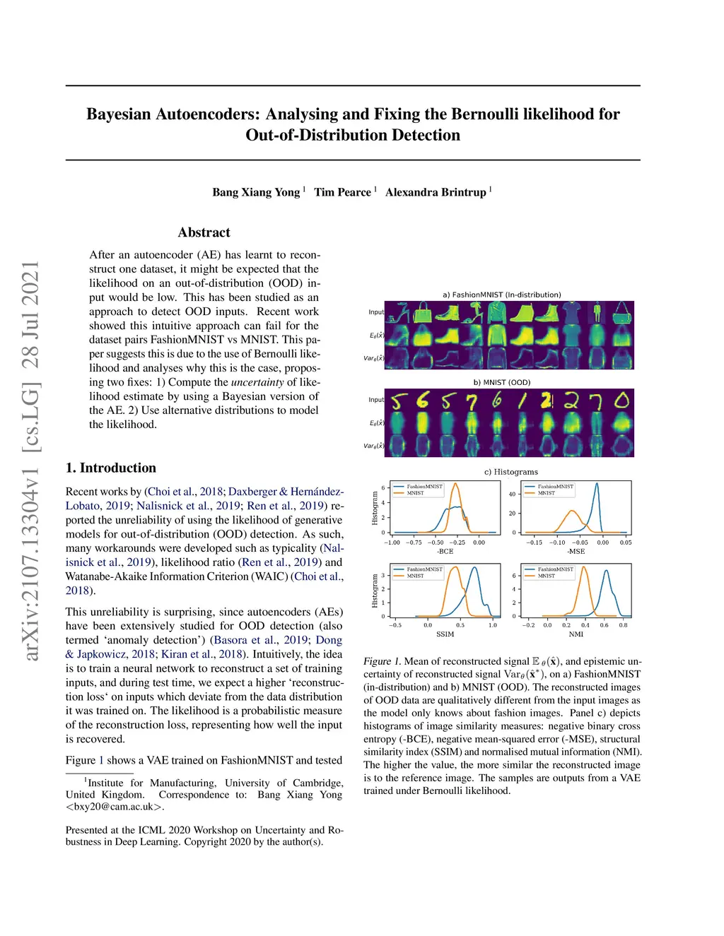 After an autoencoder (AE) has learnt to reconstruct one dataset, it might be expected that the likelihood on an out-of-distribution (OOD) input would be low. This has been studied as an approach to detect OOD inputs. Recent work showed this intuitive approach can fail for the dataset pairs FashionMNIST vs MNIST. This paper suggests this is due to the use of Bernoulli likelihood and analyses why this is the case, proposing two fixes: 1) Compute the uncertainty of likelihood estimate by using a Bayesian version of the AE. 2) Use alternative distributions to model the likelihood.