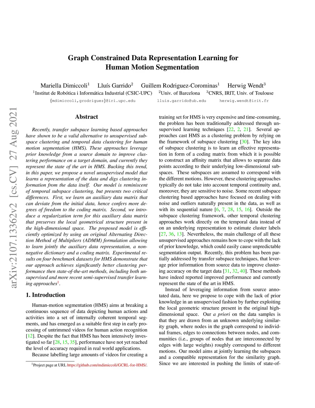 Recently, transfer subspace learning based approaches have shown to be a valid alternative to unsupervised subspace clustering and temporal data clustering for human motion segmentation (HMS). These approaches leverage prior knowledge from a source domain to improve clustering performance on a target domain, and currently they represent the state of the art in HMS. Bucking this trend, in this paper, we propose a novel unsupervised model that learns a representation of the data and digs clustering information from the data itself. Our model is reminiscent of temporal subspace clustering, but presents two critical differences. First, we learn an auxiliary data matrix that can deviate from the initial data, hence confer more degrees of freedom to the coding matrix. Second, we introduce a regularization term for this auxiliary data matrix that preserves the local geometrical structure present in the high-dimensional space. The proposed model is efficiently optimized by using an original Alternating Direction Method of Multipliers (ADMM) formulation allowing to learn jointly the auxiliary data representation, a nonnegative dictionary and a coding matrix. Experimental results on four benchmark datasets for HMS demonstrate that our approach achieves significantly better clustering performance then state-of-the-art methods, including both unsupervised and more recent semi-supervised transfer learning approaches.
