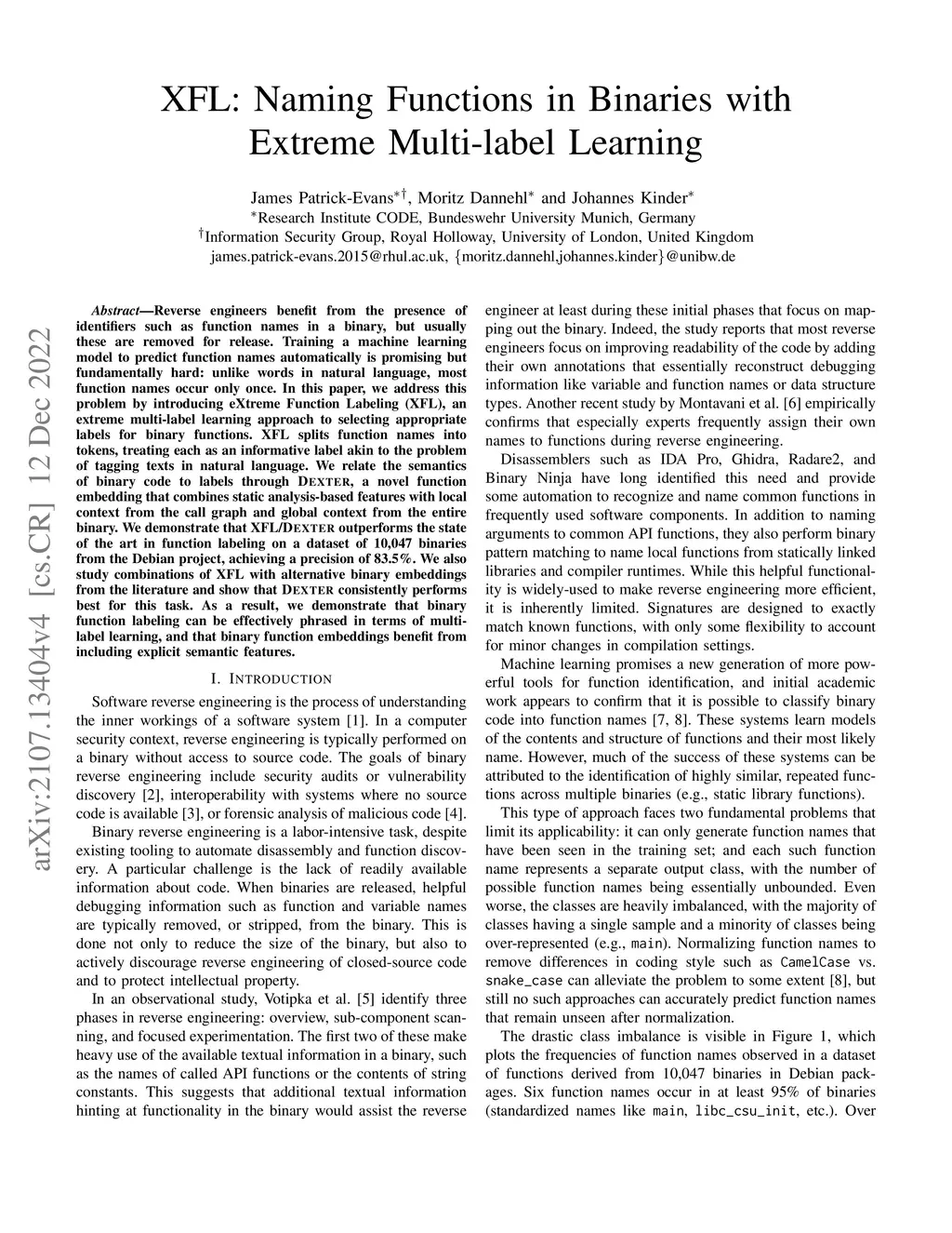 Reverse engineers benefit from the presence of identifiers such as function names in a binary, but usually these are removed for release. Training a machine learning model to predict function names automatically is promising but fundamentally hard: unlike words in natural language, most function names occur only once. In this paper, we address this problem by introducing eXtreme Function Labeling (XFL), an extreme multi-label learning approach to selecting appropriate labels for binary functions. XFL splits function names into tokens, treating each as an informative label akin to the problem of tagging texts in natural language. We relate the semantics of binary code to labels through DEXTER, a novel function embedding that combines static analysis-based features with local context from the call graph and global context from the entire binary. We demonstrate that XFL/DEXTER outperforms the state of the art in function labeling on a dataset of 10,047 binaries from the Debian project, achieving a precision of 83.5%. We also study combinations of XFL with alternative binary embeddings from the literature and show that DEXTER consistently performs best for this task. As a result, we demonstrate that binary function labeling can be effectively phrased in terms of multi-label learning, and that binary function embeddings benefit from including explicit semantic features.