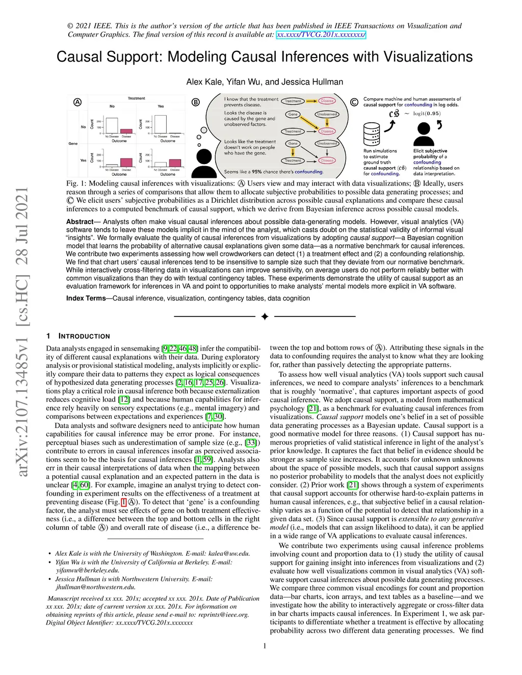 Analysts often make visual causal inferences about possible data-generating models. However, visual analytics (VA) software tends to leave these models implicit in the mind of the analyst, which casts doubt on the statistical validity of informal visual "insights". We formally evaluate the quality of causal inferences from visualizations by adopting causal support -- a Bayesian cognition model that learns the probability of alternative causal explanations given some data -- as a normative benchmark for causal inferences. We contribute two experiments assessing how well crowdworkers can detect (1) a treatment effect and (2) a confounding relationship. We find that chart users' causal inferences tend to be insensitive to sample size such that they deviate from our normative benchmark. While interactively cross-filtering data in visualizations can improve sensitivity, on average users do not perform reliably better with common visualizations than they do with textual contingency tables. These experiments demonstrate the utility of causal support as an evaluation framework for inferences in VA and point to opportunities to make analysts' mental models more explicit in VA software.