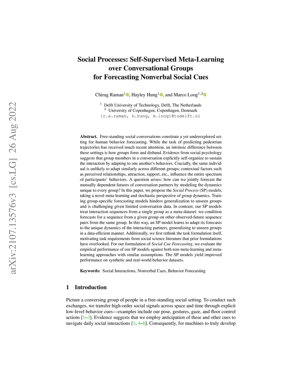 Free-standing social conversations constitute a yet underexplored setting for human behavior forecasting. While the task of predicting pedestrian trajectories has received much recent attention, an intrinsic difference between these settings is how groups form and disband. Evidence from social psychology suggests that group members in a conversation explicitly self-organize to sustain the interaction by adapting to one another's behaviors. Crucially, the same individual is unlikely to adapt similarly across different groups; contextual factors such as perceived relationships, attraction, rapport, etc., influence the entire spectrum of participants' behaviors. A question arises: how can we jointly forecast the mutually dependent futures of conversation partners by modeling the dynamics unique to every group? In this paper, we propose the Social Process (SP) models, taking a novel meta-learning and stochastic perspective of group dynamics. Training group-specific forecasting models hinders generalization to unseen groups and is challenging given limited conversation data. In contrast, our SP models treat interaction sequences from a single group as a meta-dataset: we condition forecasts for a sequence from a given group on other observed-future sequence pairs from the same group. In this way, an SP model learns to adapt its forecasts to the unique dynamics of the interacting partners, generalizing to unseen groups in a data-efficient manner. Additionally, we first rethink the task formulation itself, motivating task requirements from social science literature that prior formulations have overlooked. For our formulation of Social Cue Forecasting, we evaluate the empirical performance of our SP models against both non-meta-learning and meta-learning approaches with similar assumptions. The SP models yield improved performance on synthetic and real-world behavior datasets.