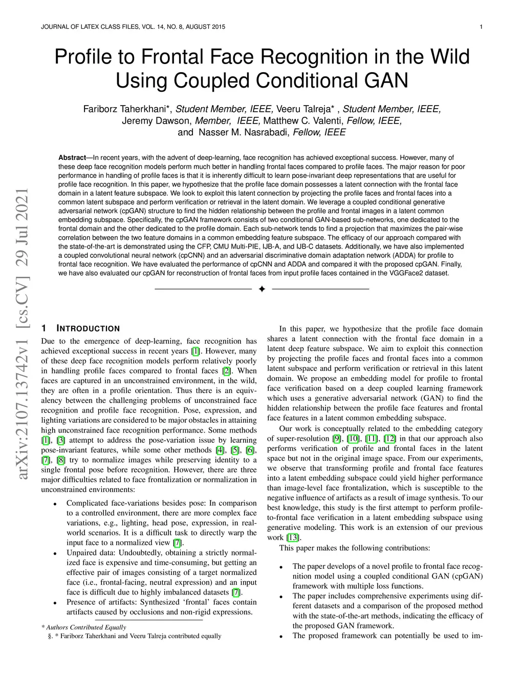 In recent years, with the advent of deep-learning, face recognition has achieved exceptional success. However, many of these deep face recognition models perform much better in handling frontal faces compared to profile faces. The major reason for poor performance in handling of profile faces is that it is inherently difficult to learn pose-invariant deep representations that are useful for profile face recognition. In this paper, we hypothesize that the profile face domain possesses a latent connection with the frontal face domain in a latent feature subspace. We look to exploit this latent connection by projecting the profile faces and frontal faces into a common latent subspace and perform verification or retrieval in the latent domain. We leverage a coupled conditional generative adversarial network (cpGAN) structure to find the hidden relationship between the profile and frontal images in a latent common embedding subspace. Specifically, the cpGAN framework consists of two conditional GAN-based sub-networks, one dedicated to the frontal domain and the other dedicated to the profile domain. Each sub-network tends to find a projection that maximizes the pair-wise correlation between the two feature domains in a common embedding feature subspace. The efficacy of our approach compared with the state-of-the-art is demonstrated using the CFP, CMU Multi-PIE, IJB-A, and IJB-C datasets. Additionally, we have also implemented a coupled convolutional neural network (cpCNN) and an adversarial discriminative domain adaptation network (ADDA) for profile to frontal face recognition. We have evaluated the performance of cpCNN and ADDA and compared it with the proposed cpGAN. Finally, we have also evaluated our cpGAN for reconstruction of frontal faces from input profile faces contained in the VGGFace2 dataset.